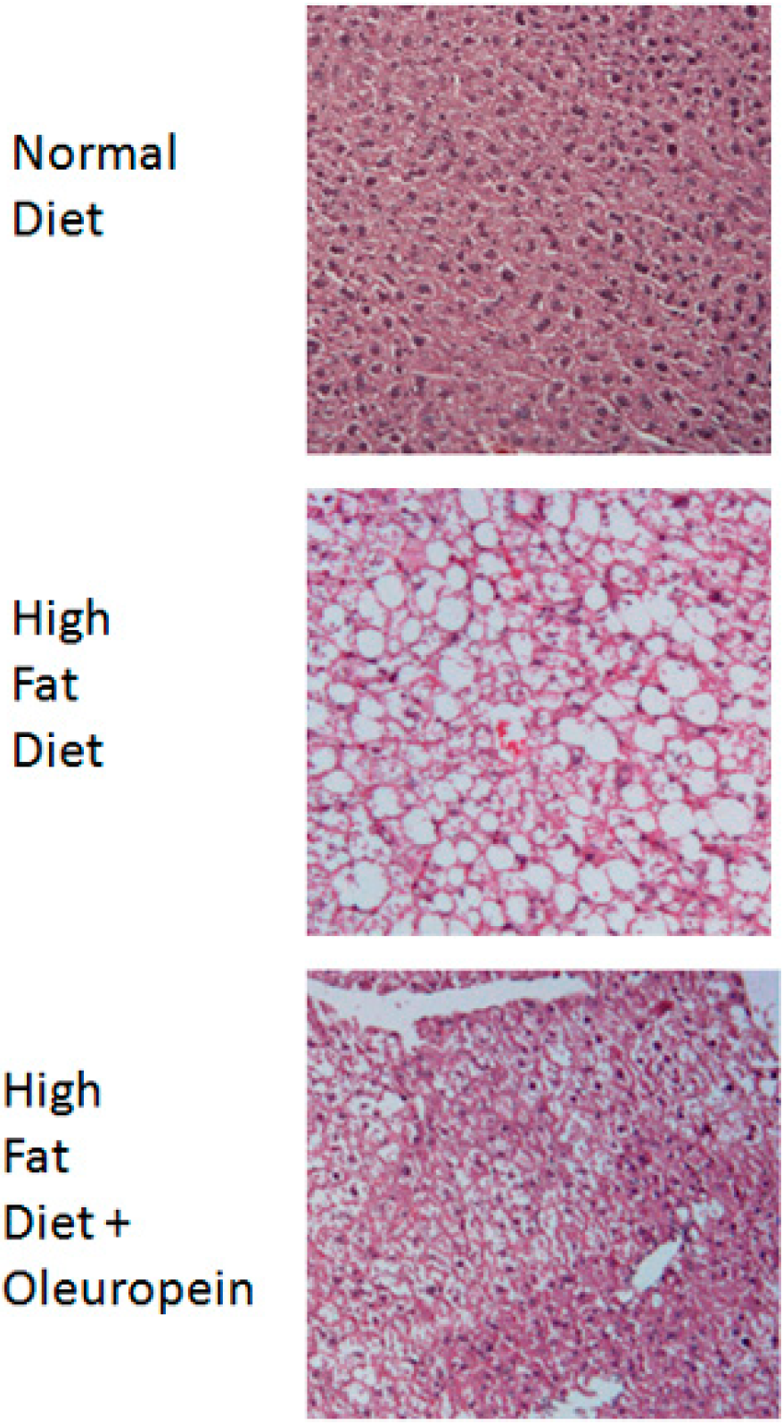 Oleuropein administration has an hepatoprotective and therapeutic effects on carbon tetrachloride-induced liver damage in mice [76]. Moreover, a diet supplemented with oleuropein reduces induced hepatic steatosis [77] and progression to non-alcoholic steatohepatitis (NASH) [78] in mice fed with a high fat diet. Data collected in our laboratory confirmed that oleuropein supplementation is able to diminish lipid accumulation in the liver of mice fed with a high fat diet (Figure 1).