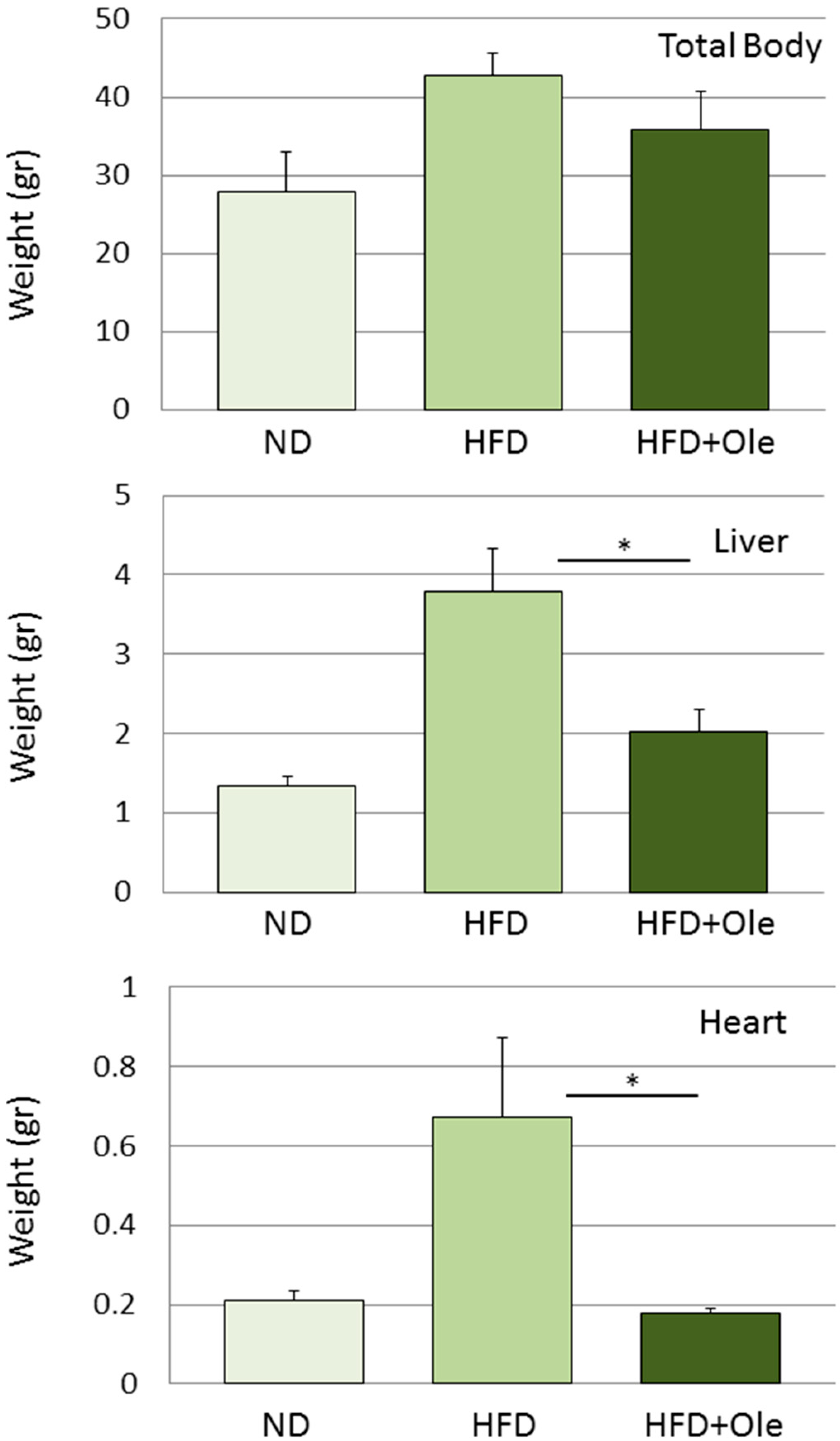 Oleuropein supplementation reduces body, liver and heart weights in high fat diet-treated mice. C57BL/6 mice were fed with a high fat diet (HFD) for eight weeks; then, animals were randomly divided into three groups: the first received a normocaloric diet (ND), the second high fat diet (HFD), the third HFD supplemented with 3% oleuropein (HFD + Ole) for further eight weeks. At the end of treatment, HFD + Ole mice had reduced weight gain (total body—25%, liver—50%, heart—70%) compared to HFD-fed mice. Data are expressed as the mean; error bars indicate the standard error; number of animals per group = 6. An asterisk denotes a statistically significant difference between HFD and HFD + Ole groups (p < 0.05 assessed with a two-tailed Student’s t-test for unpaired data).