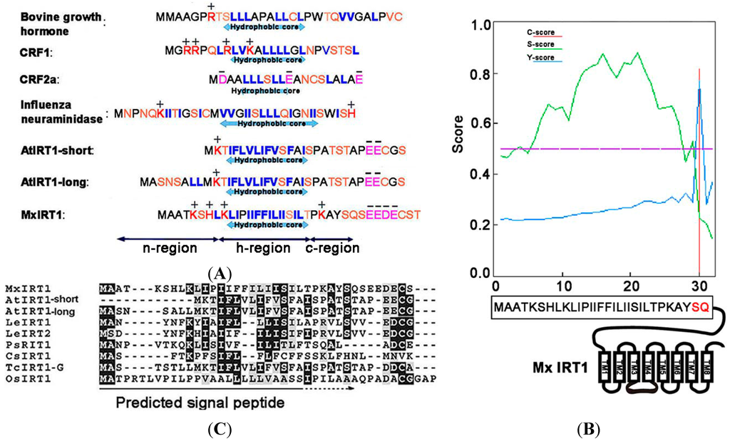 Prediction of the signal peptide (SP) on the N-terminus of Malus xiaojinensis iron-regulated transporter 1 (Mx IRT1). (A) Common features of ER (Endoplasmic reticulum)-processed SPs include a hydrophobic center region, surrounded by regions enriched in polar amino acids on both sides (blue: Hydrophobic amino acids; orange: Polar amino acids; red: Positive amino acids; and pink: Negative amino acids); (B) Mx IRT1 SP was predicted using SignalP4.1 []. C-score represents the raw cleavage site score (red); S-score indicates the SP score (green); and Y-score represents the combined cleavage site score (blue), which is a combination (geometric average) of the C-score and the slope of the S-score, providing a better cleavage site prediction than the raw C-score alone; and (C) Alignment of the predicted SP region with published IRT1 amino acid sequences, produced using ClustalW2 []. Identical residues are shown on a black background, and conservative substitutions are shown on a gray background.