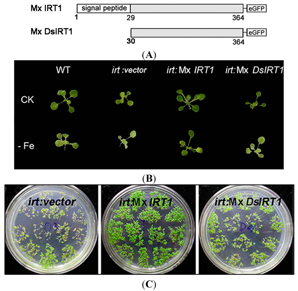 2.2. Deletion of the N-Terminal Mx IRT1 Signal Peptide (SP) Reduces Iron Uptake Ability in Arabidopsis and Yeast