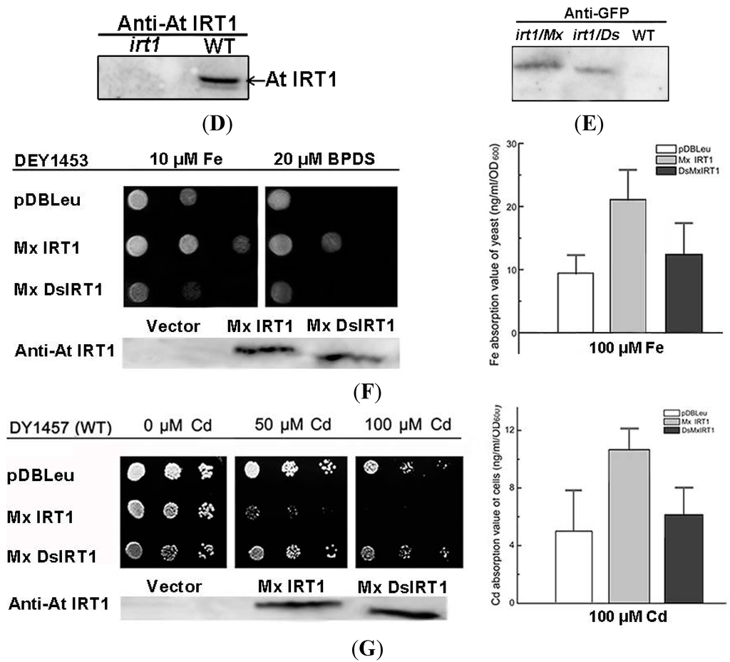 Transport ability of Mx IRT1 and Mx DsIRT1 in Arabidopsis irt1 and yeast fet3fet4 mutants. (A) Diagrams of the Mx IRT1-eGFP and Mx DsIRT1-eGFP constructs; (B) Phenotype analysis of WT (wild type) and irt1 transformed lines; WT, irt1:vector, irt1:Mx IRT1, and irt1:Mx DsIRT1 lines were grown under +Fe (CK) and −Fe conditions; (C) The germination and early growth comparisons for irt1:vector, irt1:Mx IRT1, and irt1:Mx DsIRT1 lines. Seeds from each of the three lines were germinated and grown in 1/2 MS without iron (−Fe) for 5 days; (D) Immunoblot analysis showing the presence of At IRT1 in WT, but not in Arabidopsis irt1 mutant plants. Proteins were harvested from plants after 3 days iron deficiency. The blots were probes with At IRT1 antibody; (E) Immunoblot analysis showing the presence of full length and truncated proteins in Mx IRT1-eGFP and Mx DsIRT1-eGFP transgenic lines, respectively, prepared by transforming Arabidopsis IRT1 mutant plants. The blots were probed using GFP antibody; (F) Complementation and Immunoblotting analysis of Mx IRT1 and Mx DsIRT1 in DEY1453 (left); Blots probed with At IRT1 antisera show the presence of full length Mx IRT1 and truncated Mx DsIRT1 in the transformed yeast strains; the iron content was measured using inductively coupled plasma mass spectrometry (ICP-MS) after yeast cells had been cultured for 4 h in YPD (yeast extract peptone dextrose) liquid supplemented with 100 μM Fe2+-EDTA (ethylene diamine tetraacetic acid) (right); and (G) Cadmium sensitivity and Immunoblotting experiments in DY1457 (left); Blots probed with At IRT1 antisera show the presence of full length Mx IRT1 and truncated Mx DsIRT1 in the transformed yeast strains; and the cadmium content (right) of 3 transformed DY1457 was measured using ICP-MS after 100 μM treatment for 4 h.