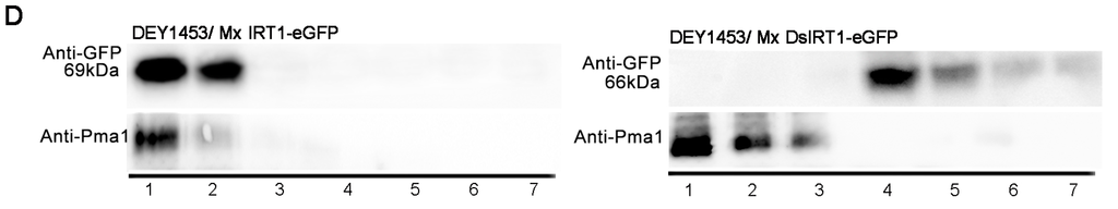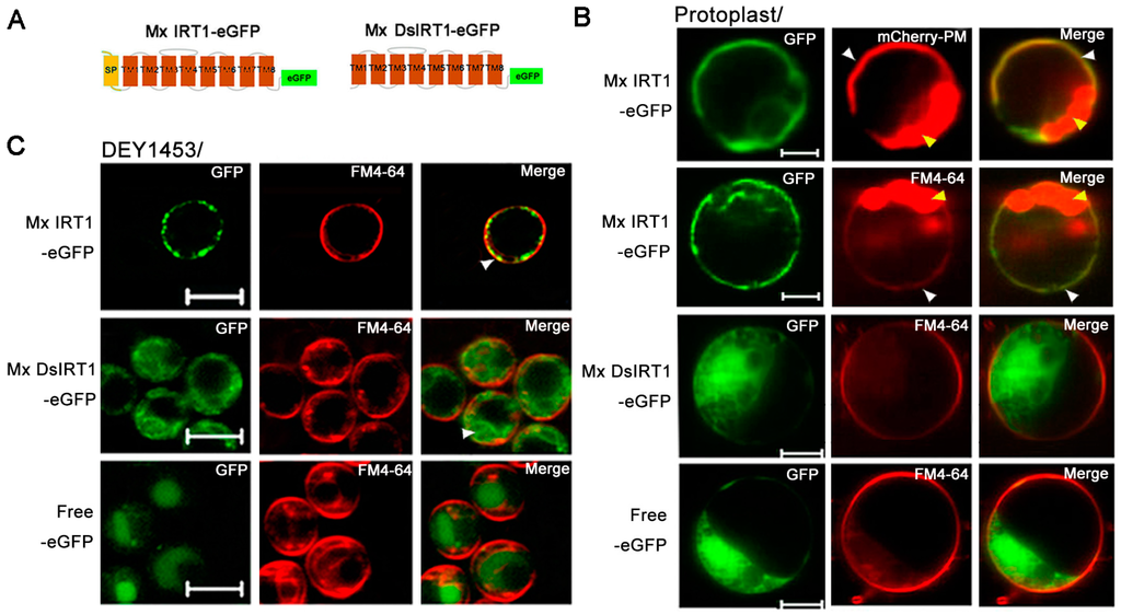 Based on Mx DsIRT1 reduced iron absorption capacity, we hypothesized that its N-terminus either plays a role in iron transport or guides Mx IRT1 to the PM for metal transport. To address the question, a GFP tag sequence was added to each of the transgenes, producing Mx IRT1-eGFP and Mx DsIRT1-eGFP fusion proteins. This tag allowed for a determination of their subcellular localization in plant protoplast and yeast cells by using fluorescent confocal microscopy (Figure 3A).