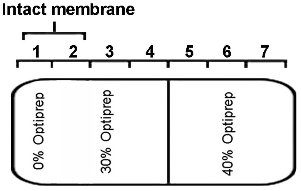 Optiprep density gradient centrifugation diagram. Intact membranes float at the interface between the 0% and 30% Optiprep, which corresponds to fraction 1 and 2.