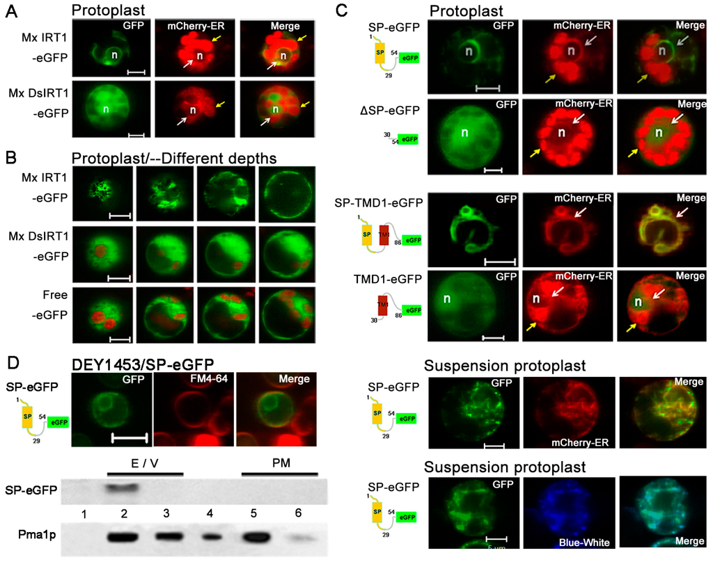 Comparative confocal fluorescent imaging shows localization of different GFP fusion proteins with or without an N-terminal SP in rice protoplast. (A) Images showing co-localization of Mx IRT1-eGFP (green) and mCherry-ER (red) (top row), with co-localization as yellow in the merged panel (white arrows); Mx DsIRT1-eGFP did not co-localized with the mCherry-ER (red) (bottom row). The strong red signal comes from the chloroplast autofluorescence, indicated by the yellow arrow; (B) Images at different depths of scanning in 3 transformed protoplasts; (C) Fluorescent localization of SP-eGFP (1–54), ΔSP-eGFP (30–54), SP-TM1-eGFP (1–86), and TM1-eGFP (30–86) in leafy protoplasts (marked by mCherry-ER) and suspension protoplast (marked by mCherry-ER (red) and ER- tracker Blue-White (blue)); and (D) Intracellular localization of SP (1–54)-eGFP in yeast; and western blot analysis of the ER/Vacuole (indicated by 2 and 3) and PM fractions (indicated by 5 and 6) from SP-eGFP transformed yeast using the GFP and Pma1p- antibodies. Scale bar: 5 μm. Note: The ER marker appears at a low intensity of red fluorescence, as indicated by the white arrow in A and C; the strong red signal comes from the chloroplast autofluorescence, as indicated by the yellow arrow. Scale bar: 5 μm; n: nucleus.