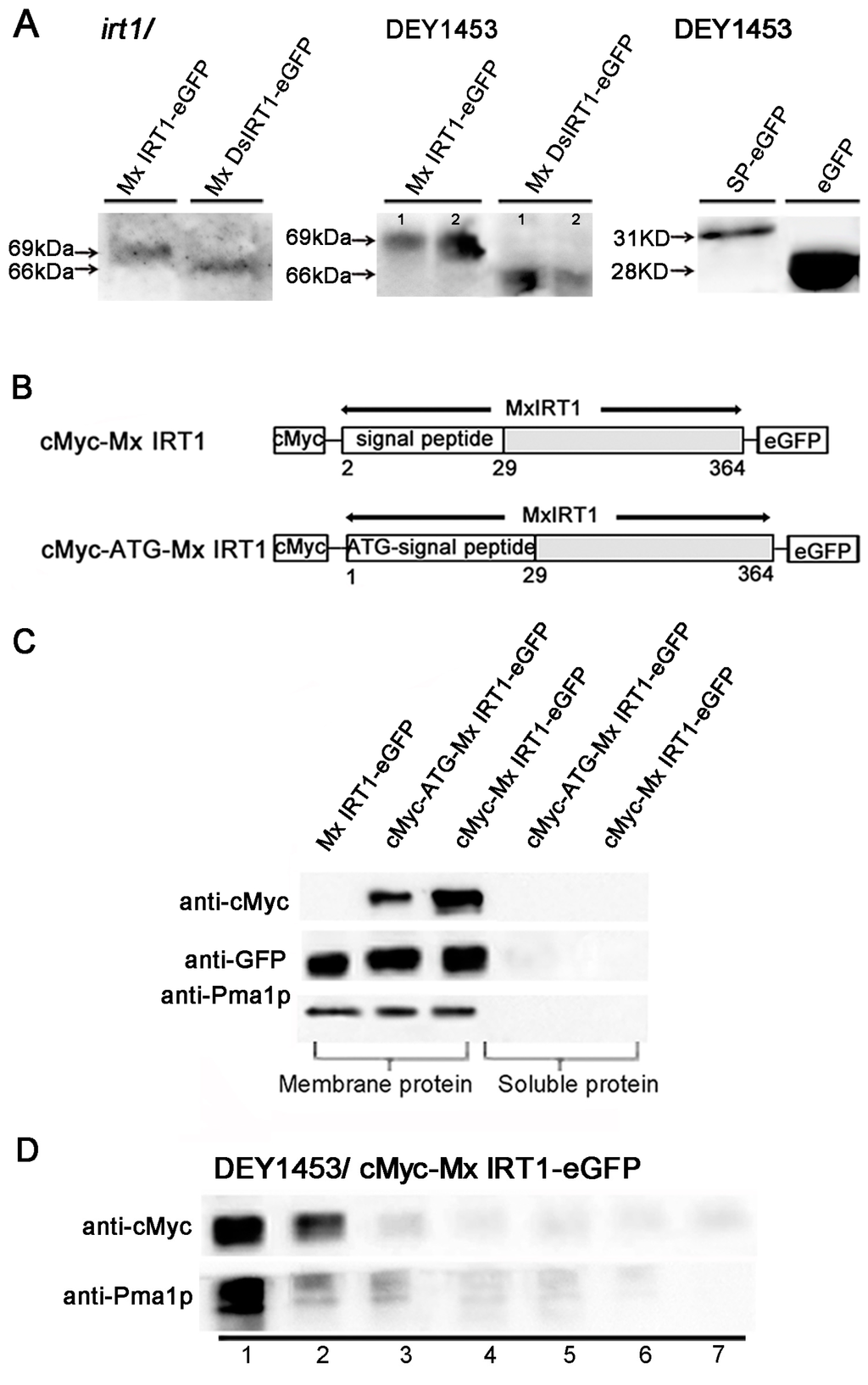 Detection of the SP using the cMyc-antibody in different fractions. (A) SDS-PAGE immunoblot analysis of the Mx IRT1-eGFP, Mx DsIRT1-eGFP, SP-eGFP, and eGFP in the total protein from transgenic Arabidopsis irt1 and yeast DEY1453 using a monoclonal GFP antibody; line 1 and 2 in DEY1453/Mx or Ds IRT1-eGFP represented the experimental repeat; (B) Schematic diagrams of the constructs of cMyc-Mx IRT1-eGFP and cMyc-ATG-MxIRT1-eGFP used for expression in yeast cells; (C) Immunoblot detection of cMyc N-terminal tagged Mx IRT1 constructs in the membrane fraction using a monoclonal cMyc antibody and an anti-Pma1p antibody to detect the membrane fraction; and (D) Analysis of cMyc-Mx IRT1-eGFP fusion proteins in the different fractions.