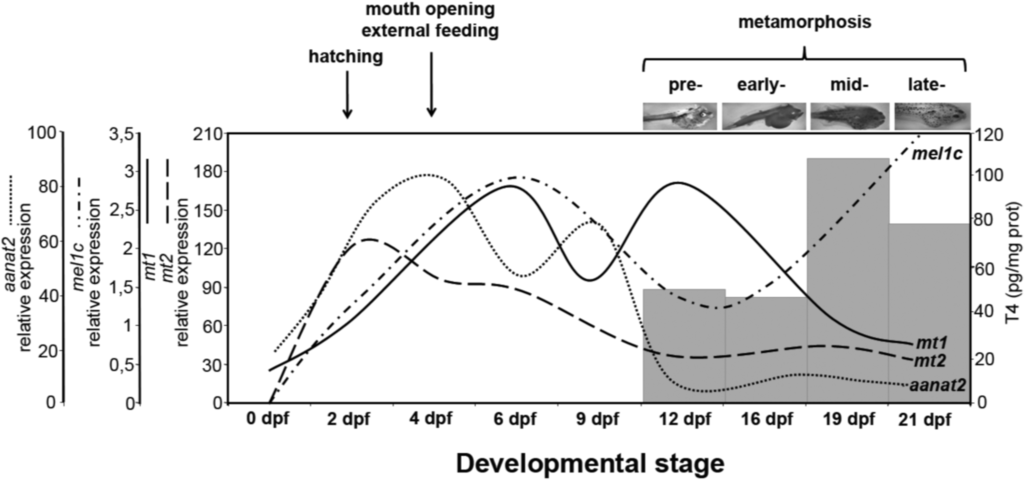 - Wright, M.L. Melatonin, diel rhythms, and metamorphosis in anuran amphibians. Gen. Comp. Endocrinol. 2002, 126, 251–254. [Google Scholar] [CrossRef] [PubMed]