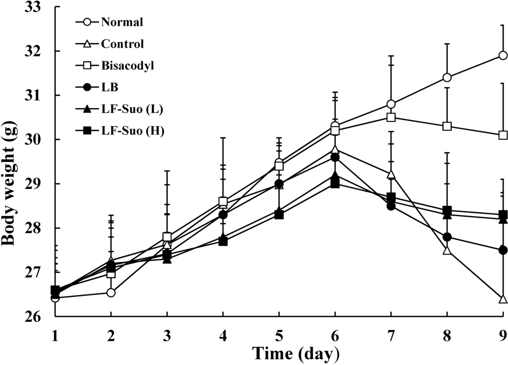 Body weight of mice during the experiment. n = 10 ICR (Institute of Cancer Research) mice in each group, bisacodyl: 100 mg/kg b.w. (body weight); LB: Lactobacillus bulgaricus (1.0 × 109 CFU/kg b.w.); LF-Suo (L): Lactobacillus fermentum Suo (1.5 × 109 CFU/kg b.w.); LF-Suo (H): Lactobacillus fermentum Suo (1.0 × 109 CFU/kg b.w.).