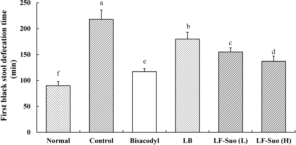 The time to the first black stool defecation for each group of mice following the administration of activated carbon, which demonstrates the constipation inhibiting effect of different treatments, is shown in Figure 2. The defecation time was the shortest (90 ± 8 min) in the normal group and the longest (218 ± 18 min) in the control group; the defecation time in the bisacodyl group was 117 ± 6 min, higher than that of the normal group. The times to the first black stool defecation for the LB, LF-Suo (L) and LF-Suo (H) groups mice were 180 ± 13, 155 ± 8 and 137 ± 10 min, respectively. According to the defecation time, LF-Suo has the strongest effect on inhibiting constipation.