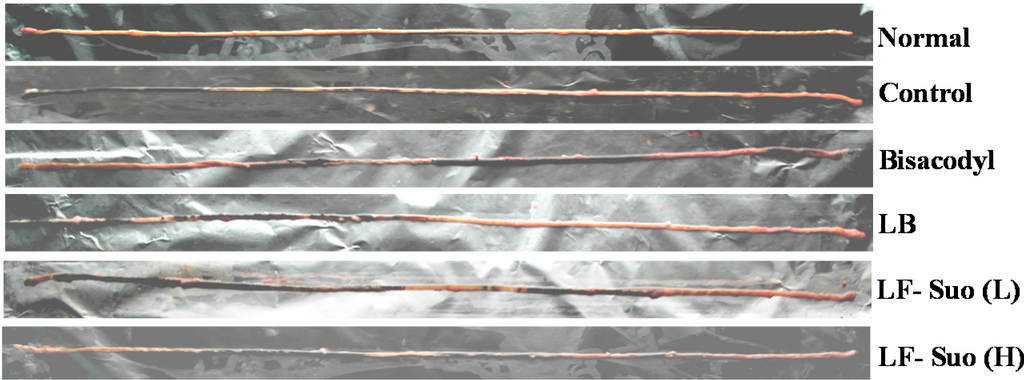 Constipation refers to bowel movements that are infrequent or hard to pass, characterized by pain in the abdomen and bloating. There are many causes of constipation including medications, poor bowel habits, low fiber diet, abuse of laxatives, hormonal disorders, and disease primarily of other parts of the body that also affect the colon. Therefore defecation is the most important criterion of constipation. This study divided defecation status into three parts: First is defecation weight (g), which can be observed as a main point to estimate constipation situation, if defecation weights are heavy, that means mice have good defecation qualities; Second is particle counts of defecation (pieces), which also clarify the mice constipation situations, more defecation pieces express that mice had good gastrointestinal movement; third is water content of defecation, where higher water content indicates better stool qualities. From the first to the sixth day, defecation weight (g), particle counts of defecation (pieces) and water content of defecation (%) in each group were not significantly different. Defecation weight (g) and particle counts of defecation (pieces) in the bisacodyl group were slightly more than in other groups (Table 4). When it induced constipation, starting from the seventh day to ninth day, defecation weight (g), particle counts of defecation (pieces) and water content of defecation (%) were decreased to 0.37 g, 19 pieces and 16% in the control group. Particle counts of weight and defecation (pieces) were decreased to 0.74 g/38, 0.40 g/21, 0.58 g/27 and 0.67 g/31 pieces, water content of defecation (%) were decreased to 40%, 23%, 29% and 36% in bisacodyl, LB, LF-Suo (L) and LF-Suo (H) groups, respectively. These results demonstrated that LF-Suo has a better defecation status after induced constipation, and thus, that LF-Suo can have a positive effect for constipation relief.