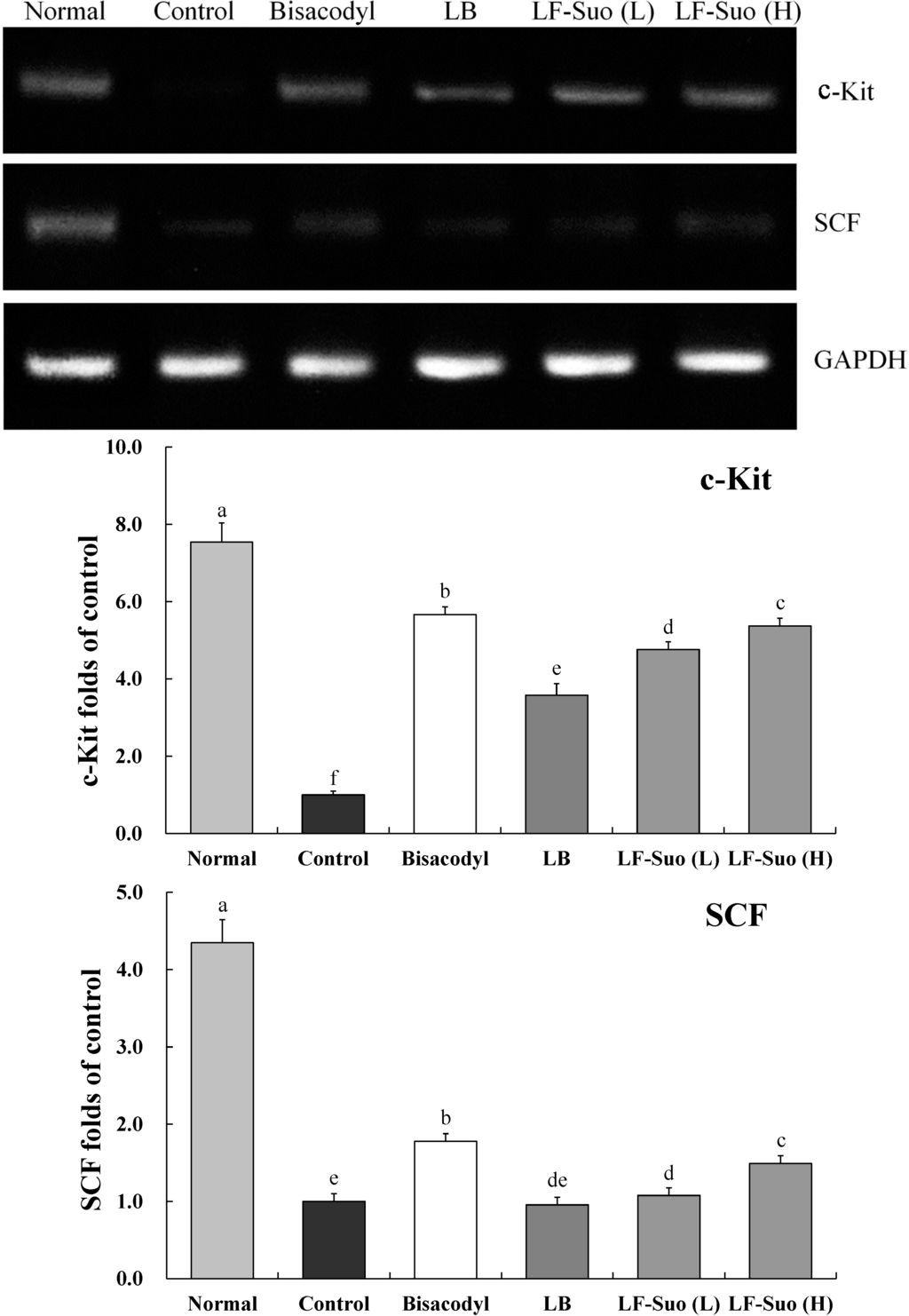 Effects of Lactobacillus fermentum Suo on the mRNA expression of c-Kit and SCF in small intestine. n = 10 ICR mice in each group, bisacodyl: 100 mg/kg b.w.; LB: Lactobacillus bulgaricus (1.0 × 109 CFU/kg b.w.); LF-Suo (L): Lactobacillus fermentum Suo (0.1 × 109 CFU/kg b.w.); LF-Suo (H): Lactobacillus fermentum Suo (1.0 × 109 CFU/kg b.w.); a–f Mean values with different letters over the bars are significantly different (p < 0.05) according to Duncan’s multiple range test.