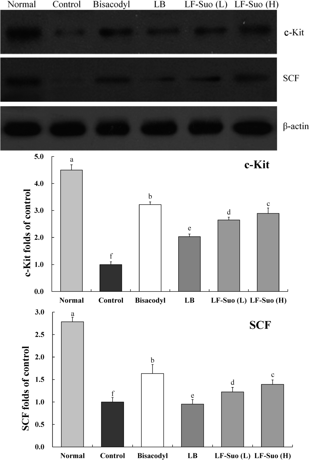 GAPDH gene, a housekeeping gene in most cells, is commonly used as a loading control for qPCR [30]. In western blotting assay, β-actin is also used as a loading control for the protein degradation of cancer cells [31]. In this study, no differences were observed in GAPDH and β-actin expression among all groups, which enable their use as controls for other genes. Interstitial cells of Cajal (ICC) is a kind of mesenchymal cell between the intestinal nervous system and smooth muscle, which plays an important role in regulating intestinal nerve signals to smooth muscle cells [32]. According to research, patients with constipation have less ICC in intestines. C-Kit is the specific marker of ICC, which is the key to the proliferation of ICC. Brading et al. found that the concentration of SCF is very important to the cultivation of the ICC. Without SCF, the cultivation of ICC cannot survive. Further study on animals with constipation found that with lower amounts of ICC in colon tissue of mice with constipation, c-Kit and SCF expression levels will decline [33]. SCF and c-Kit in mice with constipation are less than normal mice, this difference between constipation mice and normal mice can be reduced by LF-Suo.