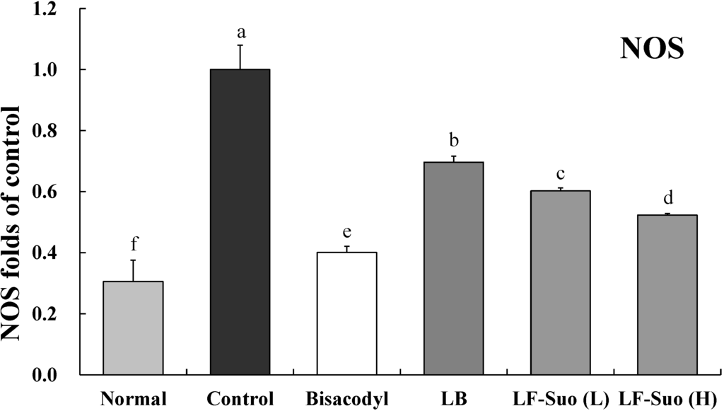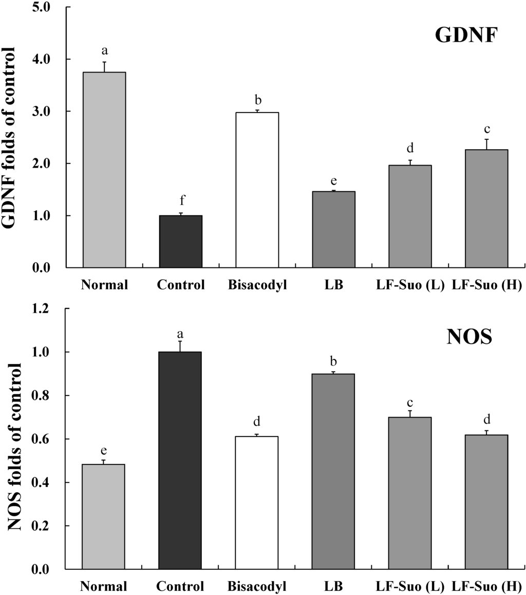 TRPV1 has a close relation between bowel movement and absorption. Activated TRPV1 can trigger the releasing of the neurotransmitter, which leads to the disorder of small intestine movement. The increasing of TRPV1 expression is a striking phenomenon of the intestinal damage. Due to the damage of intestines and disorder of movements, constipation patients have a much higher TRPV1 expression [34]. GDNF is a kind of active protein factor which can control the growth and development of nerve cells, protect and repair the damaged nervous fiber. GDNF can adjust ganglion cells to function. Enhancement of GDNF content can contribute to repair the damaged intestines, which can avoid constipation [35]. NOS enzyme is key to produce endogenous NO which widely exists in gastrointestinal tissues from the esophagus to the anus sphincter and plays an important role in adjusting gastrointestinal movement. The increase of NO has striking effects on colonic motility disorder of STC patient. NOS control can reduce the content of NO, which is a feasible way to control constipation [36]. LF-Suo could significantly increase the GDNF expression of small intestinal tissue and reduce the TRPV1 and NOS expression in the process of mice with constipation, which could inhibit constipation.