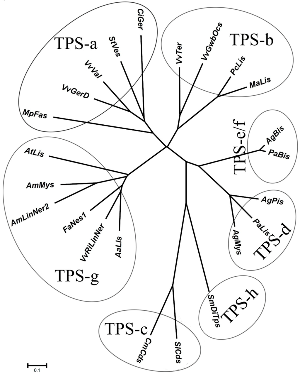 Much evidence has demonstrated that higher plants like grape produce terpenenoid precursor, isopentenyl diphosphate (IPP), through two distinct routes: cytosolic mevalonic acid (MVA) pathway and plastidial 2C-methyl-d-erythritol 4-phosphate (MEP) pathway [,]. The condensation of IPP and its allylic isomer dimethylallyl diphosphate (DMAPP) yields geranyl diphosphate (GPP), farnesyl diphosphate (FPP) and geranylgeranyl diphosphate (GGPP) under the action of GPP synthase, FPP synthase and GGPP synthase, respectively. Afterwards, these products successively convert into different kinds of terpenoids, such as monoterpenes (C10), sesquiterpenes (C15), diterpenes (C20), triterpenes (C30), carotenoids (C40), and so on []. In this process, terpene synthase (TPS) plays a critical role in the formation of monoterpenes and sesquiterpenes [,]. According to previous reports on phylogenetic analysis of TPS amino acid sequences [,,], TPS family is classified into seven subfamilies designated as TPS-a, TPS-b, TPS-c, TPS-d, TPS-e/f, TPS-g and TPS-h []. Among these, the members of TPS-g and TPS-b have been in vitro demonstrated to convert GPP, FPP and GGPP into monoterpenes, sesquiterpene and diterpene, respectively [,,,].