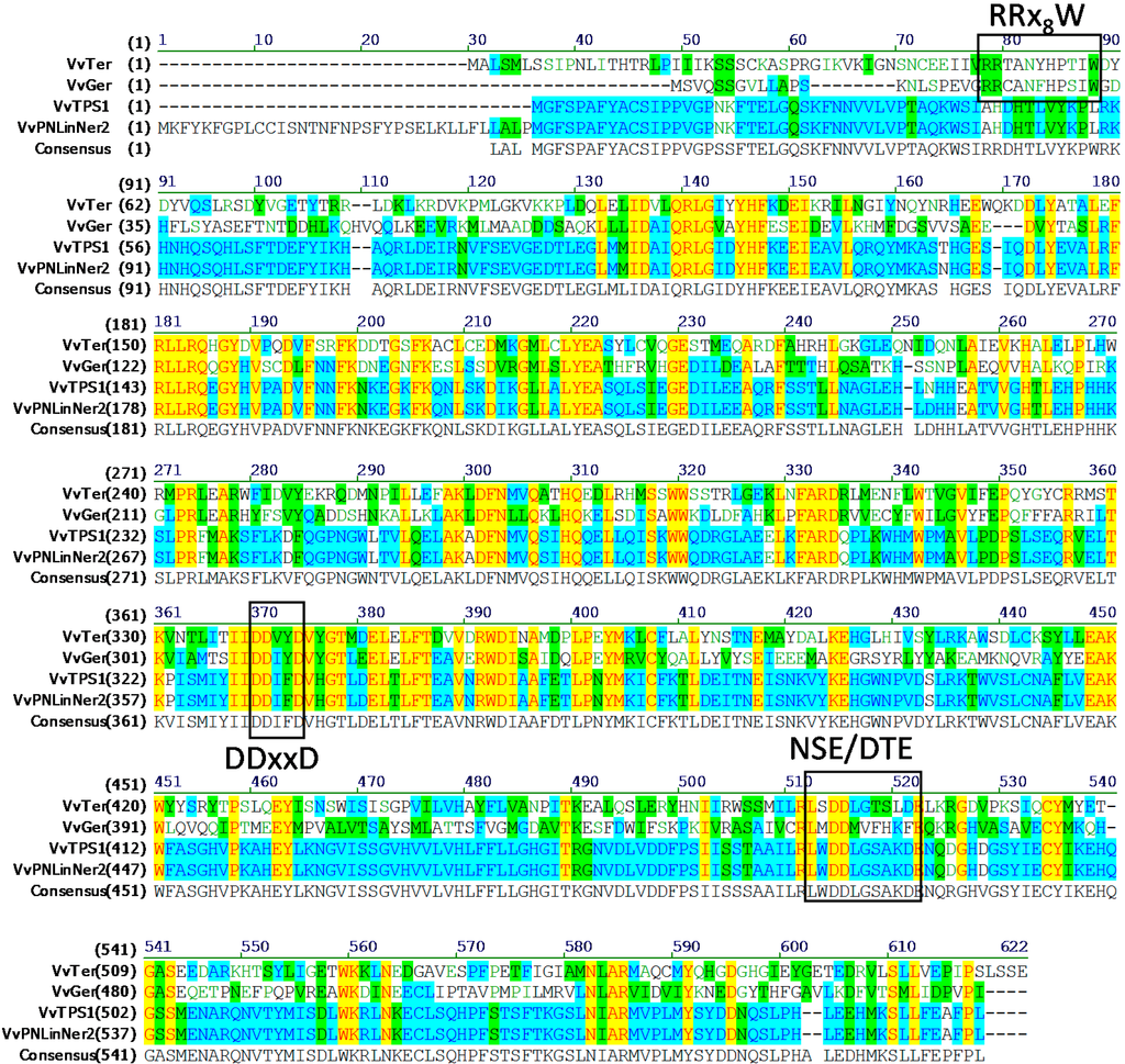 Alignment of the amino acid sequence of VvRiLinNer with other VvTPS. The alignment of VvRiLinNer predicted amino acid sequence with other VvTPS was performed using Align X (Vector NTI Advance 11, Invitrogen). VvTer (GenBank No. AAS79351): (−)-α-terpineol synthase (Martin and Bohlmann 2004 []); VvGerD (GenBank No.Q6Q3H3): (−)-germacrene D synthase (Lücker et al. 2004 []); VvPNLinNer2 (GenBank No. HM807392): linalool/nerlidol synthase, VvCSLinNer (GenBank No. HM807393): linalool/nerlidol synthase (Martin et al. 2010 []). Letters in different colors or background colors indicate different degrees of sequence similarity between. Following are the explanations in detail. Letters in black font without the background: nonsimilar; green font without the background: weakly similar; green background: block of similar; blue background: conservative; yellow background: identical.