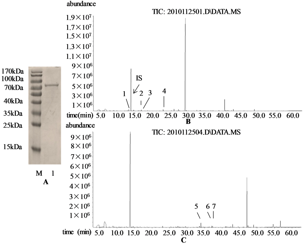 Analysis of SDS polyacrylamide gels of the purified recombinant VvRiLinNer proteins (A) and GC-MS analysis of the products of recombinant VvRiLinNer reaction system (B,C). In (A), M: Protein Molecular Weight Marker; 1: the purified protein VvRiLinNer. The apparent molecular weight of expressed recombinant proteins VvRiLinNer was estimated approximately 82 kDa, which is bigger than the predicted proteins from cDNA sequences because of the presence of the His-Tag (approximately 16 kDa); In (B) and (C), the reaction system contained the prokaryotically-expressed VvRiLinNer and geranyl diphosphate (B) or farnesyl diphosphate (C). The reaction product (3S)-linalool or (E)-neroidol was authentically identified. Compounds marked in numbers of (B) and (C) are listed as follows: 1 β-myrcene, 2 (Z)-β-ocimene, 3 (E)-β-ocimene, 4 alloocimene, 5 β-farnesene, 6 α-bisabolol, 7 α-farnesene. Among them, the compounds one & five were authentically identified, the others were tentatively identified according to MS spectra comparison with NIST 05 library.