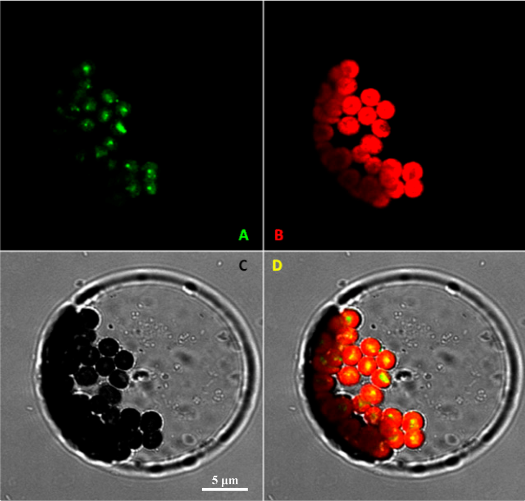 Confocal laser scanning microscopy of transiently expressed VvRiLinNer-GFP fusions in Arabidopsis protoplasts (A) Green fluorescent protein fluorescence of VvRiLinNer-GFP; (B) Chlorophyll autofluorescence; (C) Light-microscopy image of intact protoplast. Bar: 5 μm; (D) Merged images. All images were taken with the 40× water-immersion objectives on the Zeiss LSM 510 (Zeiss, Germany).