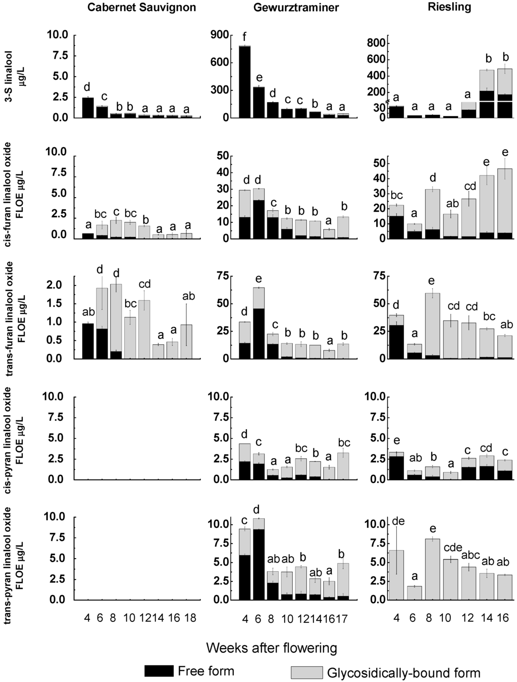 Profiling of linalool and its related oxide in developing grape berries. Each data point is the mean of three values and their standard deviation. Different letters (a–f) indicate that the concentrations of the compound had significantly difference at p < 0.05 according to Duncan’s multiple range test in SPSS. Furan linalool oxide equivalents (FLOE).