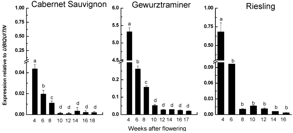 Grape berries (Vitis vinifera L. “Riesling”, “Cabernet Sauvignon”, “Gewurztraminer”) were sampled randomly every two weeks from four weeks after full bloom (WAF) to commercial harvest from 10-year-old grapevines grown in a vineyard located in the suburbs of Beijing, China. Grape berries earlier than four-week were not considered in this study because it was difficult to fully remove the seeds from these small berries. At this location, the commercial harvest date for these three varieties was different: 16 WAF for “Riesling”, 18 WAF for “Cabernet Sauvignon” and 17 WAF for “Gewurztraminer”. At each sampling, about 1000 berries were selected from at least 100-cluster selections at similar position of 50 whole vine selections. Any physically injured, abnormal and infected berries were not selected. The sampling time was fixed at around 10:00 A.M. in the morning. Samples were placed in foam boxes, and transported to the laboratory within two hours. The selected berries were washed with distilled water and dried briefly at room temperature. The seeds of these berries were removed by hand and the remainders were then immediately frozen in liquid nitrogen and stored at −80 °C until use.