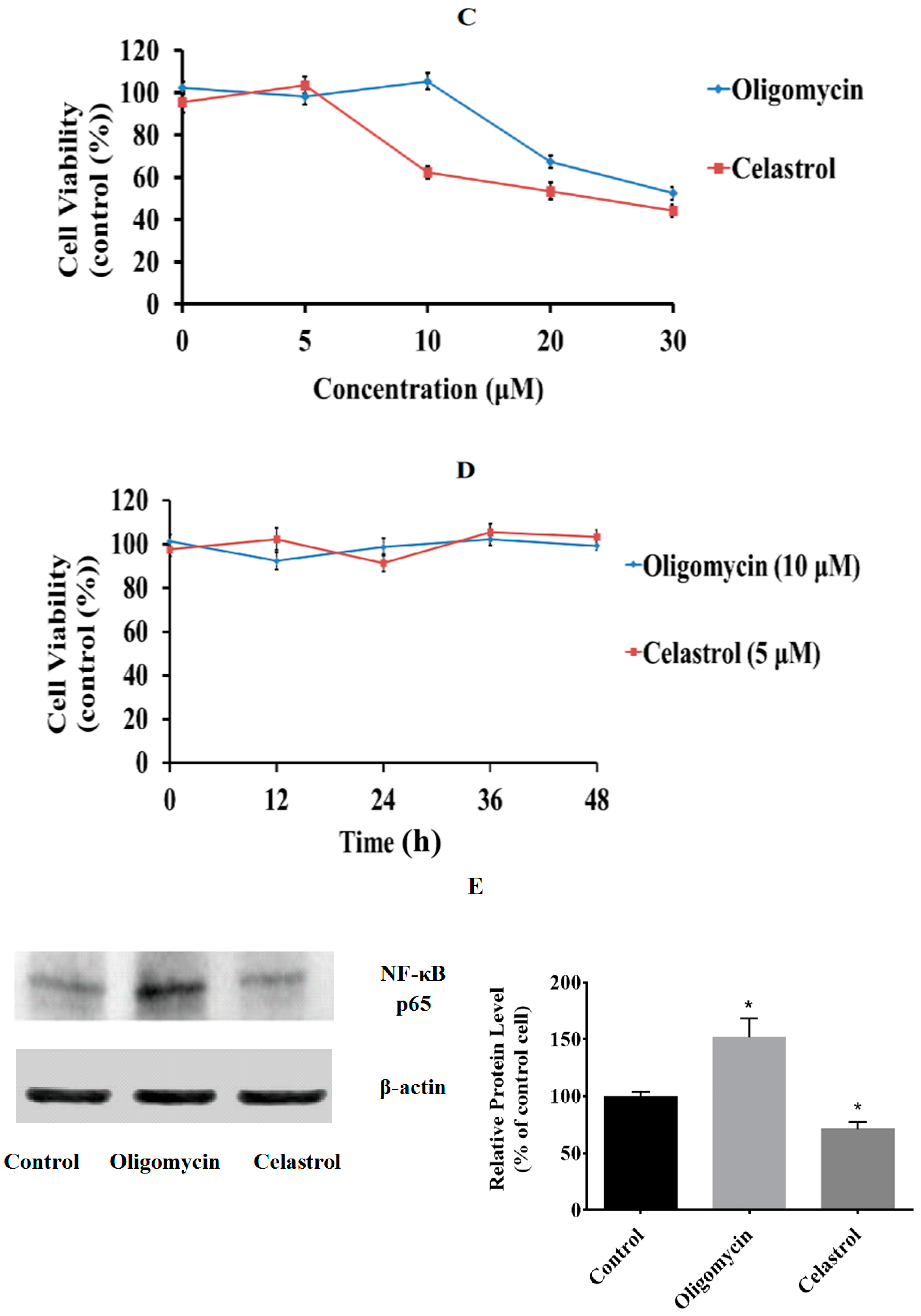 2.1. Effect of Oligomycin and Celastrol on the Cell Viability and NF-κB Expression of 3T3-L1 Adipocytes