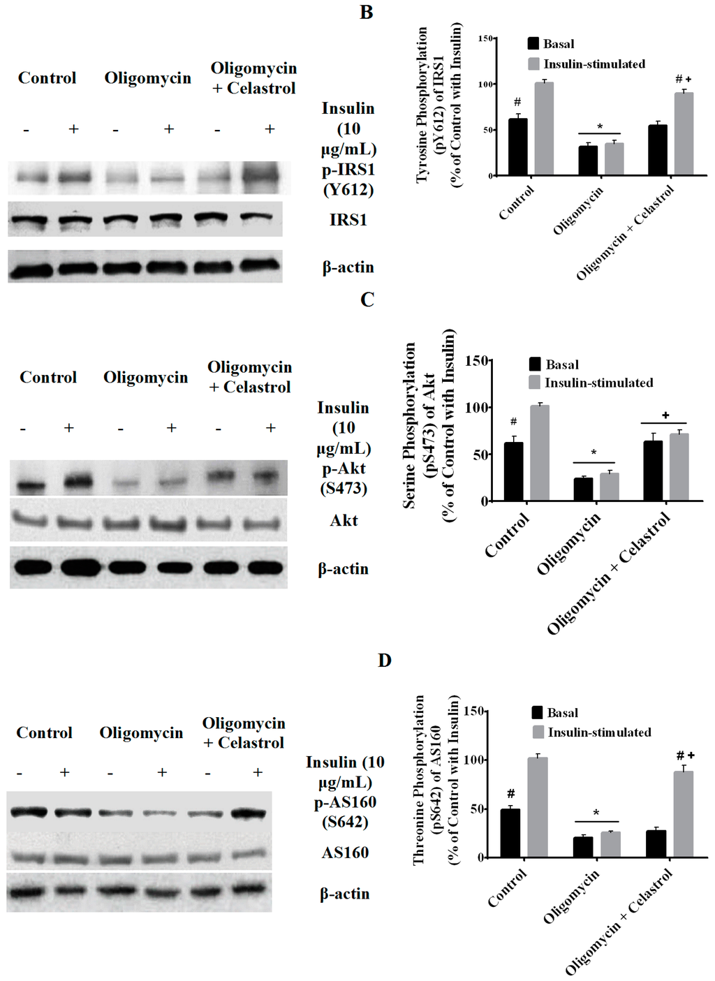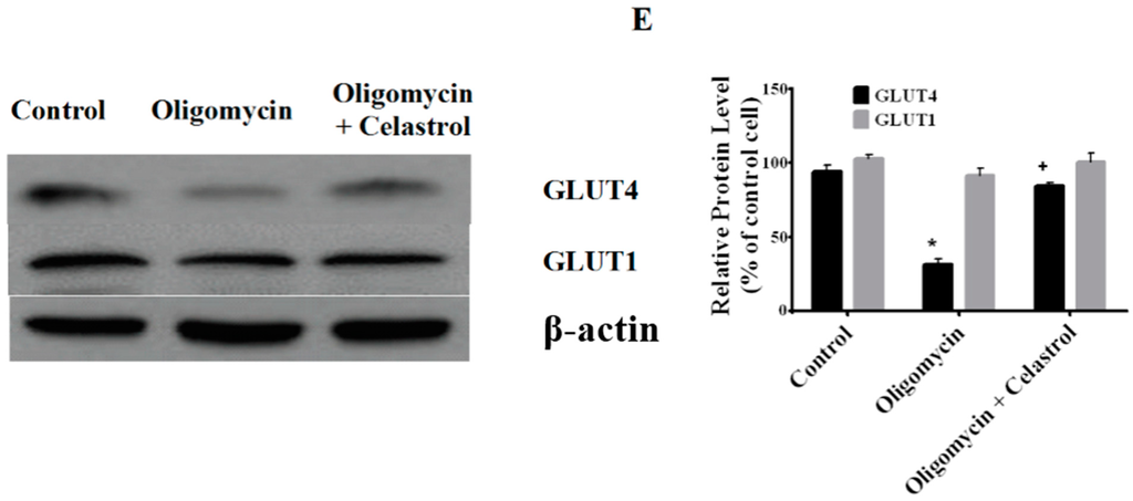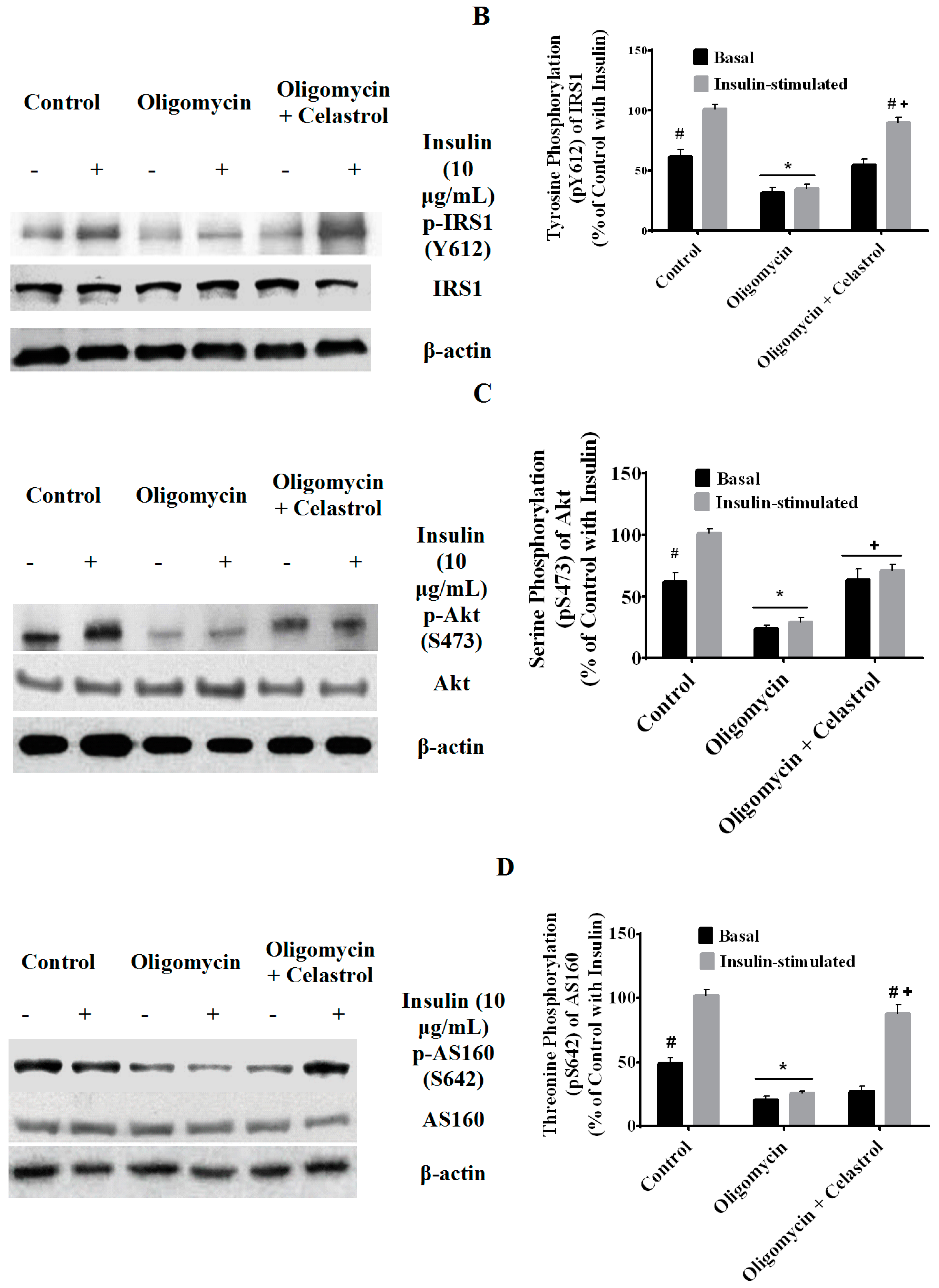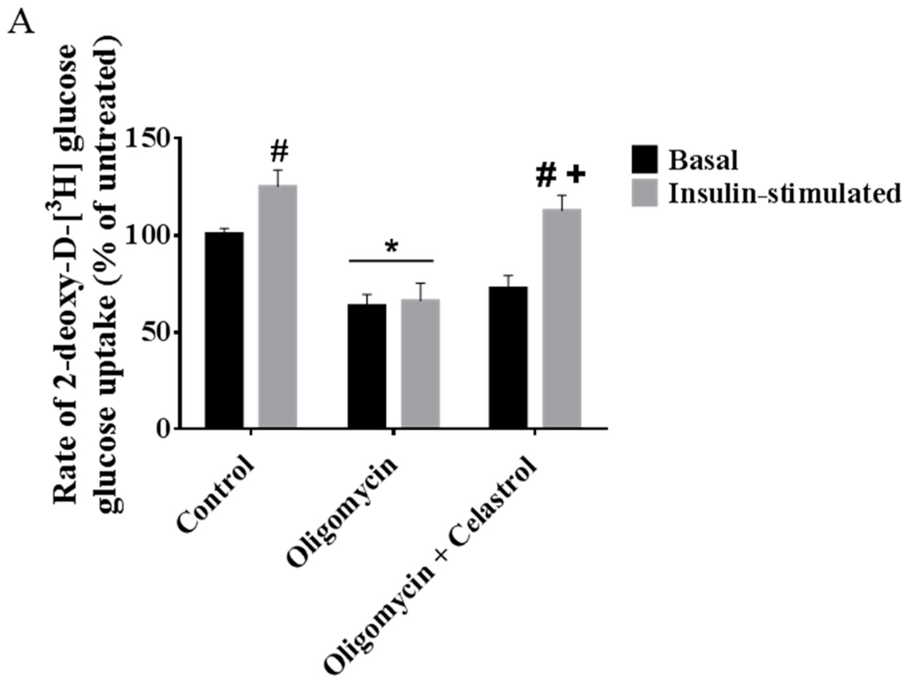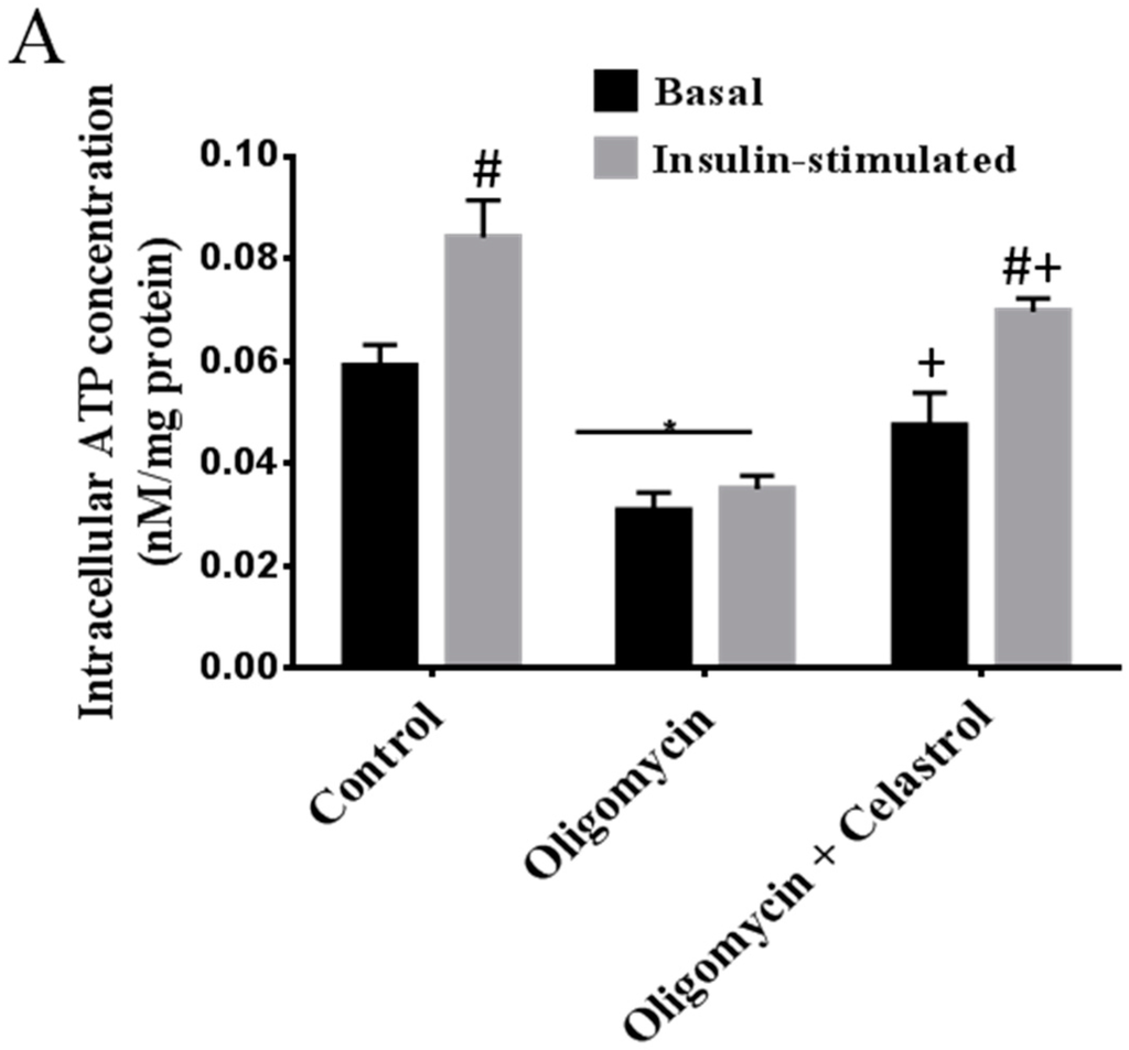 2.7. Co-Incubation of Celastrol Lead to the Restoration of Insulin-Induced Glucose Uptake Activity and Improved Insulin Signaling Cascades in Oligomycin-Treated 3T3-L1 Adipocytes