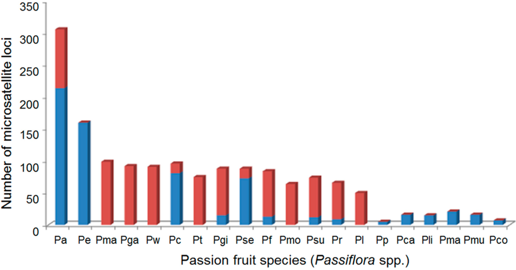Microsatellite markers available for Passiflora species, including markers characterized in this study (red columns) and in previously published studies (blue columns). Passiflora alata (Pa), P. edulis (Pe), P. malacophylla (Pma), P. galbana (Pga), P. watsoniana (Pw), P. cincinnata (Pc), P. tenuifila (Pt), P. gibertii (Pgi), P. setacea (Pse), P. foetida (Pf), P. morifolia (Pmo), P. suberosa (Psu), P. rubra (Pr), P. laurifolia (Pl), P. pohlii (Pop), P. caerulea (Pca), P. ligularis (Pli), P. maliformis (Pma), P. mucronata (Pmu) and P. contracta (Pco).