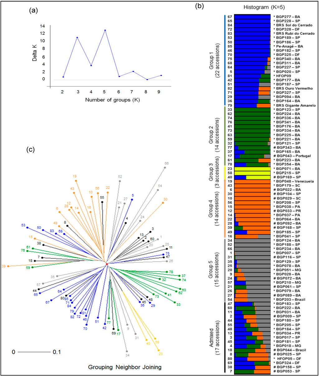 For the 85 P. edulis accessions, the Bayesian assignment method revealed five clusters and three clusters as the most likely K’s [43], and these groups were partially concordant with the dendrogram based on the neighbor-joining method (Figure 3c).