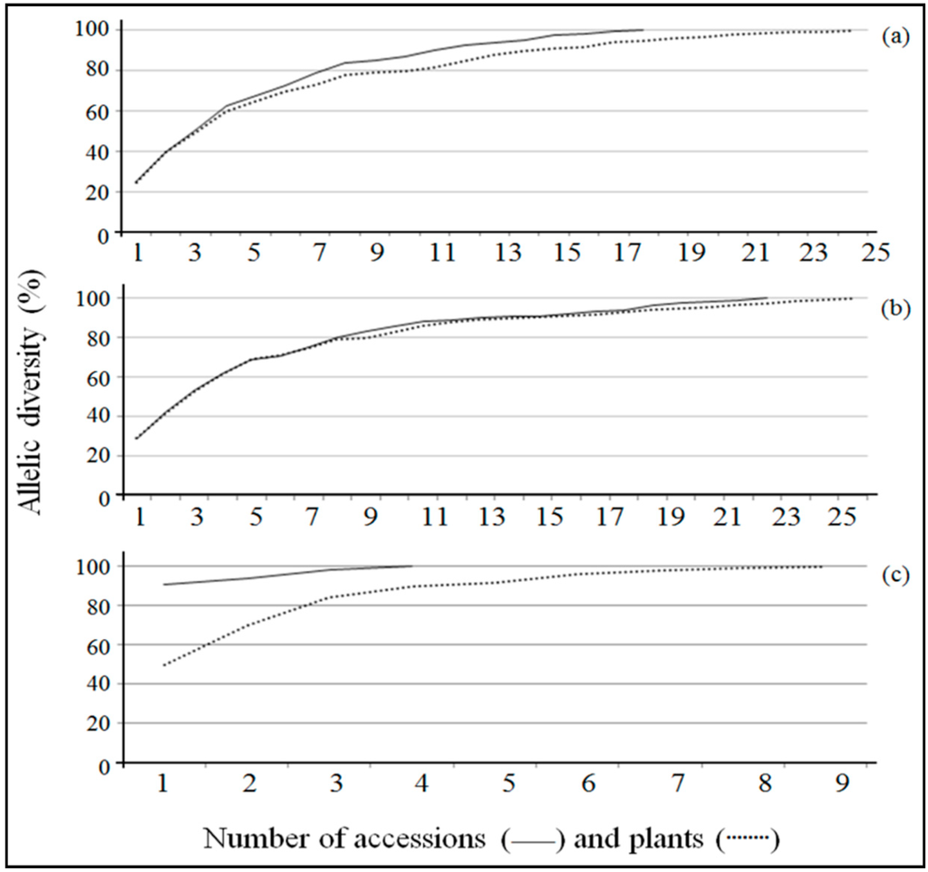 The minimum numbers of accessions necessary to represent at least 70% of the allelic diversity present in the germplasm evaluated for P. cincinnata, P. edulis and P. setacea were five, six and one, respectively. Moreover, 18 (25 plants), 23 (26 plants) and 4 (9 plants) accessions were required to ensure that all the alleles identified at SSR loci would be retained in core collections for P. cincinnata, P. edulis and P. setacea, respectively (Figure 5 and Table S5).