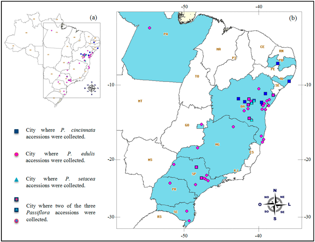 - Ferreira, F.R. Recursos genéticos de Passiflora. In Maracujá: Germoplasma e Melhoramento Genético; Faleiro, F.G., Junqueira, N.T.V., Braga, M.F., Eds.; Embrapa Cerrados: Planaltina, Brazil, 2005; pp. 41–50. (In Portuguese) [Google Scholar]