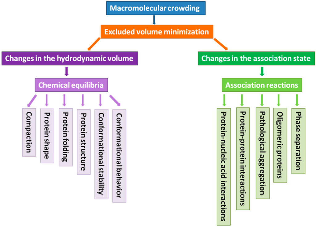 Schematic representation of the potential effects of excluded volume on the behavior of proteins in crowded milieu.