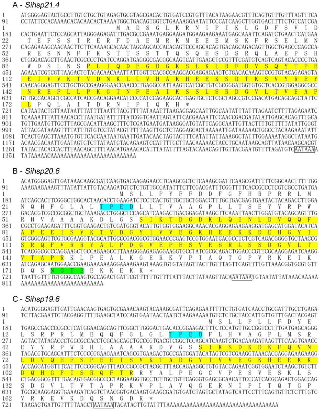 Nucleotide and deduced amino acid sequences of small heat shock proteins (sHSPs) genes from Sesamia inferens. sHSP genes include Sihsp21.4 (A); Sihsp20.6 (B); and Sihsp19.6 (C). HSP20 family profiles, typical α-crystalline domains, are shaded in yellow; Casein kinase II phosphorylation sites (TPED) are shaded in cyan; N-Glycosylation site (NGTE) is shaded in green; The putative polyadenylation signals are boxed.