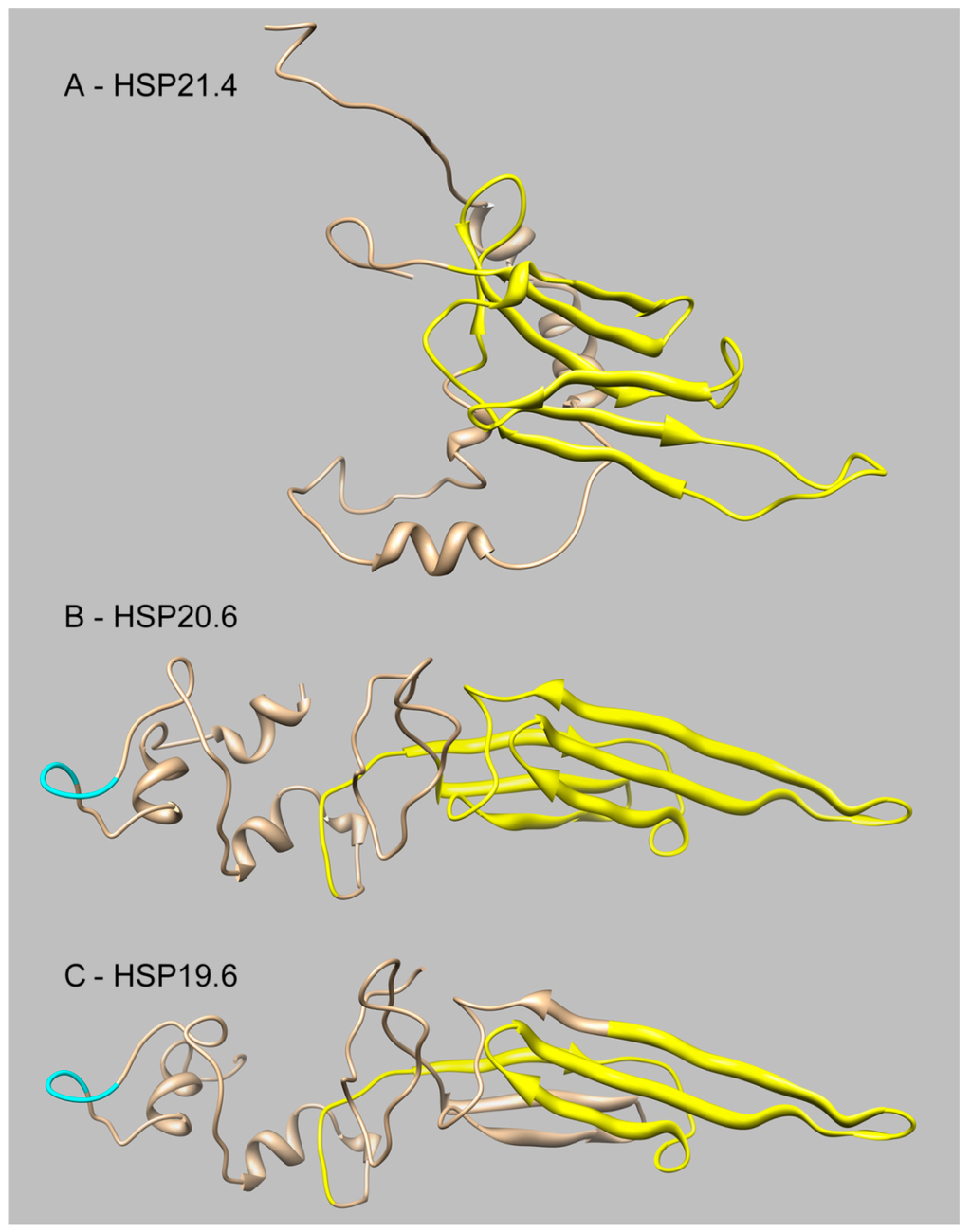 The structural prediction of sHSPs from Sesamia inferens. sHSPs include HSP21.4 (A); HSP20.6 (B); and HSP19.6 (C). HSP20 family profiles; Typical α-crystalline domains are indicated in yellow, kinase II phosphorylation sites (TPED) are indicated in cyan, peptides are indicated in brown.