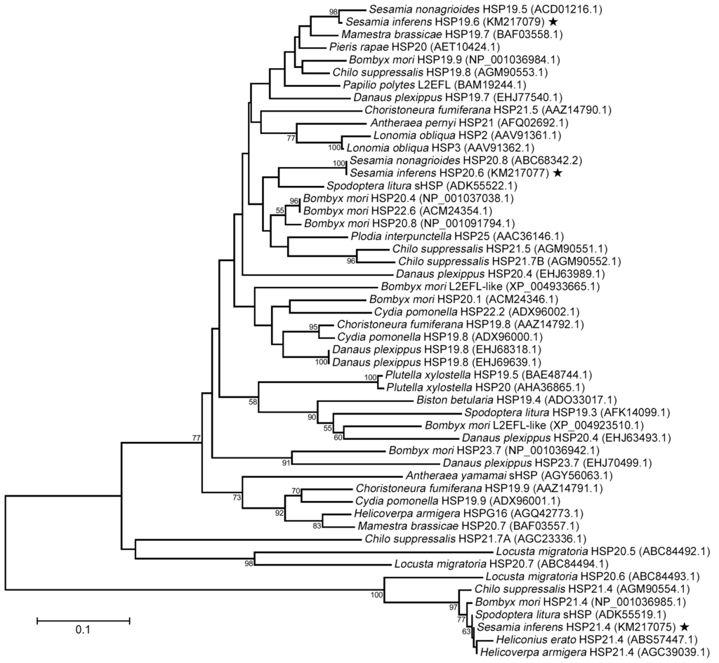 Phylogenetic tree of Sesamia inferens and other insect species sHSPs based on neighbor-joining method. The S. inferens shsps are labeled with five-pointed star. The Locusta migratoria HSP20.5, L. migratoria HSP20.6 and L. migratoria HSP20.7 were used as the out groups. Origin of sHSP proteins and their GenBank accession numbers are showed in the figure. Numbers on the branches are the bootstrap values obtained from 1000 replicates (only bootstrap values >50 are shown).