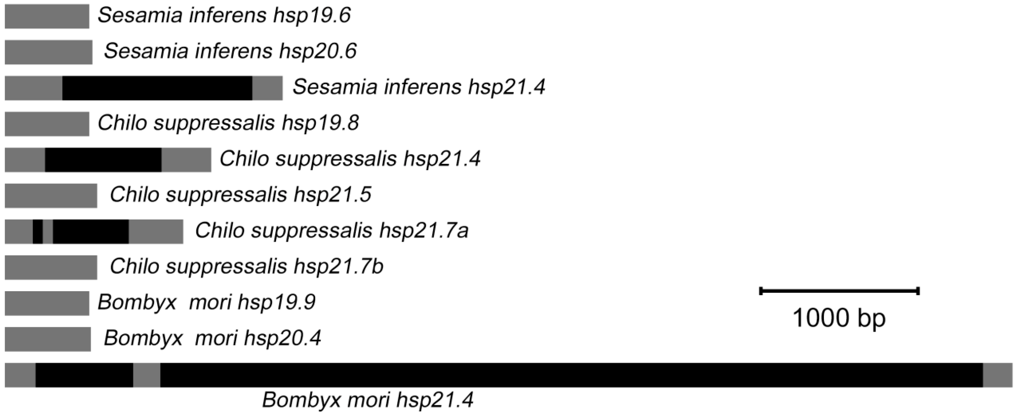 Schematic representation of genomic structures of three lepidopteran insect shsps. Origin of shsps genomes and their GenBank accession numbers: Sesamia inferens hsp19.6 (KM217080), S. inferens hsp20.6 (KM217078), S. inferens hsp21.4 (KM217076), Chilo suppressalis hsp19.8 (KC210020), C. suppressalis hsp21.4 (KC210021), C. suppressalis hsp21.5 (KC210022), C. suppressalis hsp21.7A (KC210023), C. suppressalis hsp21.7B, (KC210024), Bombyx mori hsp19.9 (BGIBMGA004540-TA), B. mori hsp20.4 (BGIBMGA004541-TA), and B. mori hsp21.4 (BGIBMGA000944-TA). Gray and black rectangles are used to highlight the exons and introns, respectively.
