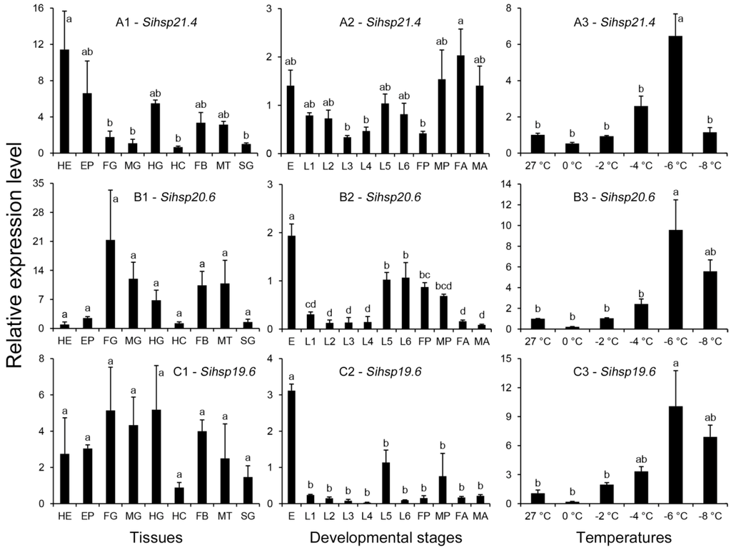 Relative mRNA expression levels of Sihsp21.4 (A); Sihsp20.6 (B); and Sihsp19.6 (C) in different tissues of the 5th instar larvae (1), different developmental stages (2), and under low-temperature stress (3). HE: Head; EP: Epidermis; FG: Foregut; MG: Midgut; HG: Hindgut; HC: Haemocytes; FB: Fat body; MT: Malpighian tubules; SG: Salivary glands; E: Egg; L1: First instar larva; L2: Second instar larva; L3: Third instar larva; L4: Forth instar larva; L5: Fifth instar larva; L6: Six instar larva; FP: Female pupa; MP: Male pupa; FA: Female adult; and MA: Male adult. Each treatment includes three replicates. The data are denoted as mean ± SE. Different letters above bars represent significant differences in the relative expression levels at the 0.05 level (Tukey’s multiple range test).