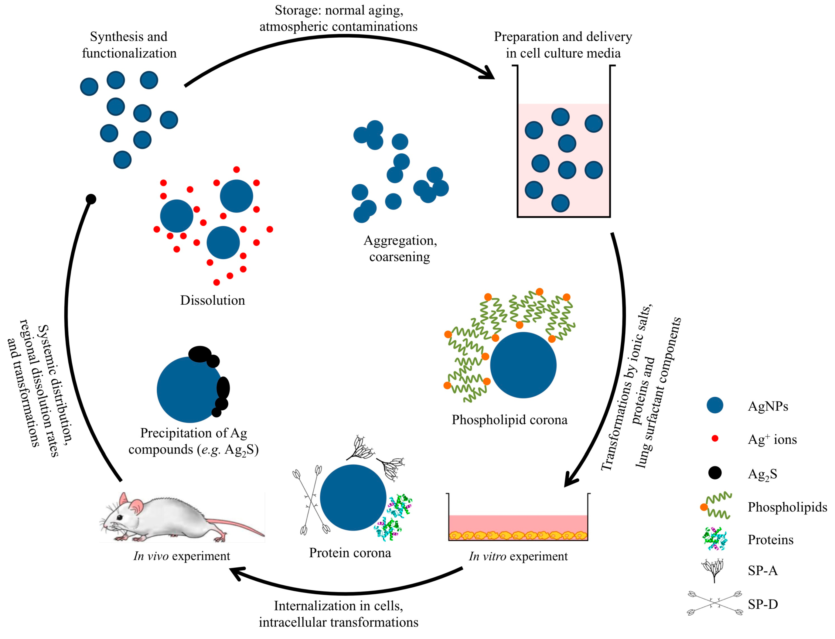 Moreover, in order to understand the discrepancies between the results of previous studies and elucidate the mechanisms of biological action of AgNPs, any transformations of the particles must be carefully considered at each stage of the in vitro experiment. More specifically, there are three steps to consider: (i) Preparation of the AgNPs and delivery to the biological medium; (ii) Transformations in the cell culture medium, either due to ionic salts or proteins, as well as the lung surfactant, prior to interaction with the cells; and (iii) Transformations of the AgNPs following internalization into the cell. This will require meticulous particle characterisation and sophisticated imaging techniques under difficult experimental conditions.