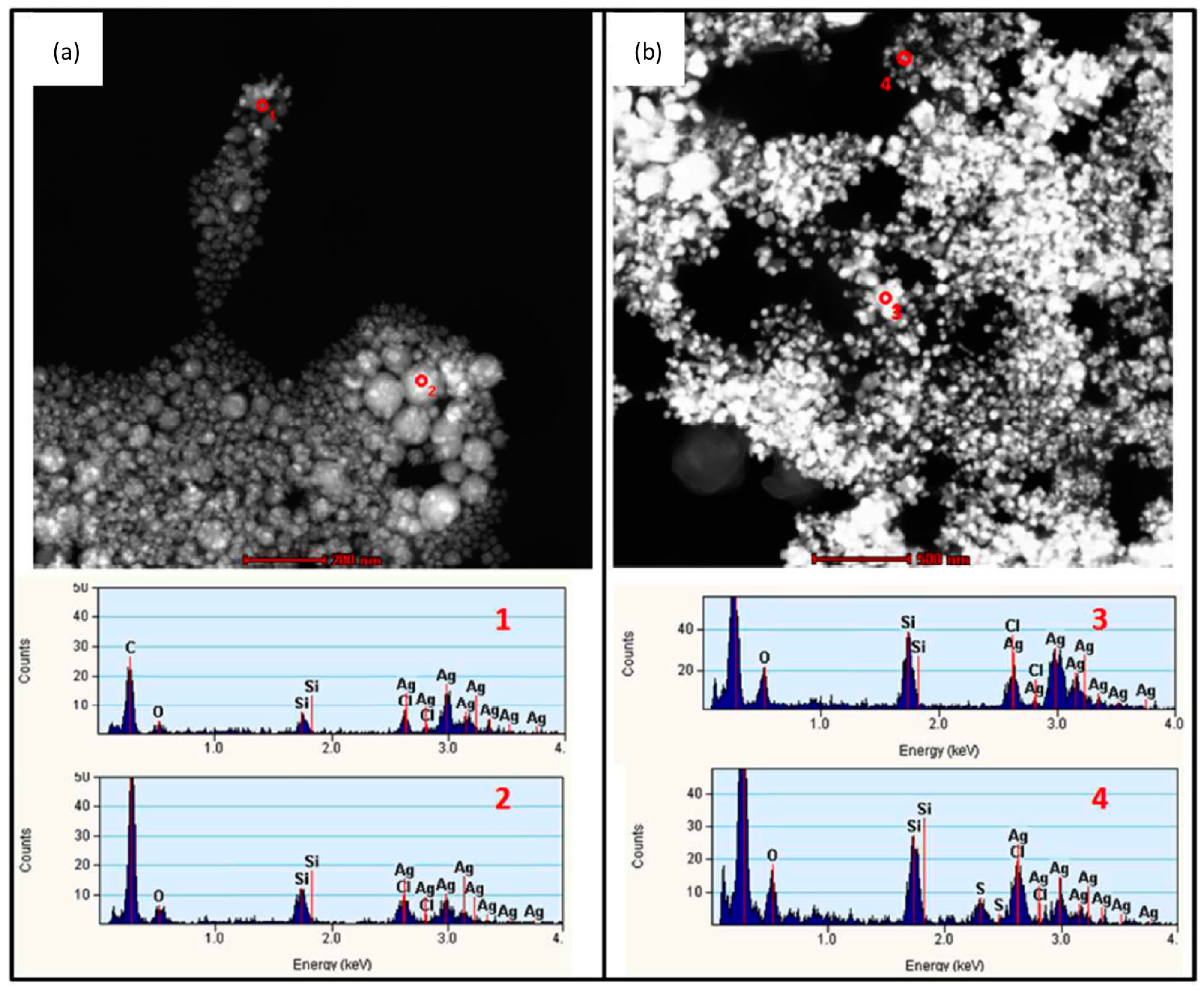 To allow interaction with cells in culture, tissue or organisms, as-synthesized AgNPs are usually suspended in biocompatible aqueous tissue culture medium. Depending on the composition and exposure time to the biological environment, agglomeration/aggregation of the particles could take place or there may be alteration of their dissolution profile. Several factors such as ionic strength and composition of the dispersion medium [27,28,29,139,140], pH [22,141], dissolved organic matter [142], dissolved oxygen concentration [14] and temperature [26] have been shown to affect the stability of AgNPs and are consequently expected to have an impact on their bioreactivity. Therefore an assessment of the properties of AgNPs in the extracellular medium, before or during cell exposure tests, is also crucial. This has recently been highlighted by Chen et al., who reported cell culture media-induced changes to the chemistry of silver nanowires (AgNWs) using high resolution analytical electron microscopy (HRTEM) (Figure 2) [143]. It was demonstrated that silver sulphide (Ag2S) crystals formed on the surface of AgNWs following incubation in DCCM-1 cell culture medium. Ionic silver released from the surface of AgNWs will transform to Ag2S due to its extremely low water solubility (Ksp = 5.92 × 10−51) [144]. This silver-to-silver sulphide transformation will substantially reduce the Ag+ ion release rate; therefore reduced AgNP toxicity could be expected. Indeed, some studies have shown low toxicity of Ag2S NPs and reduced antibacterial activity of AgNPs because of sulphidation [145,146]. Moreover, studies to determine the amount of Ag+ ions dissolved in media, which are known as one of the major factors affecting Ag toxicity, and the impact of this ionic species on cells are quite rare [27,28]. Inductively coupled plasma sources (ICP-OES and ICP-MS) and atomic absorption spectroscopy (AAS) techniques are commonly used to correlate the dissolution rate of AgNPs with their toxicity profiles. However, there are discrepancies in the data provided by different authors, probably due to the use of inconsistent methodologies (e.g., experimental setup, separation method) and incomplete NP characterization [24,60,112,147]. Moreover, AgNO3 is frequently used as a control to study the effects of free Ag+ ions but the fact that addition of AgNO3 to cell culture media rapidly leads to the precipitation of insoluble Ag compounds has not been addressed. Using analytical TEM techniques, we have shown that the precipitates from AgNO3 in RPMI-1640 medium consisted of small particles, with sizes from 20 to 200 nm, that were likely a mixture of silver oxide (Ksp= 4 × 10−11) and silver chloride (Ksp= 1.77 × 10−10) (Figure 3). The amount of free Ag+ measured by ICP-OES was less than 5% of the total Ag+ added [143]. Therefore, a combination of characterization techniques is necessary in order to understand which particulate species actually interact with the cells.