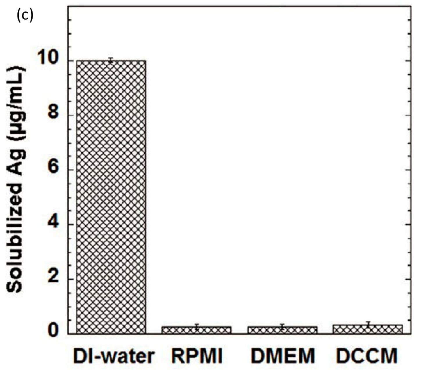 (a,b) HAADF-STEM-EDX characterization of the precipitates formed after the incubation of 17.0 µg/mL AgNO3 (equal to an Ag concentration of 10 μg/mL) in (a) RPMI-1640 and (b) DCCM-1 cell culture medium, at 37 °C for 0.5 h. The corresponding STEM-EDX spectra 1–4 were collected from the areas 1–4 marked in (a,b); The precipitates were collected by filtering the solution through 2 kDa filter membrane and were washed three times with DI-water. In both cell culture media, the particles have sizes that range from ~20 to ~200 nm. STEM-EDX analysis reveals that the precipitates in RPMI-1640 are probably a mixture of silver oxide and silver chloride. The insoluble compounds formed in DCCM-1 likely also contain silver sulphide; (c) Inductively coupled plasma optical emission spectroscopy (ICP-OES) analysis of solubilized silver concentrations of 17 μg/mL AgNO3 (equal to an Ag concentration of 10 μg/mL) in deionized (DI) water, RPMI-1640, DMEM, and DCCM-1 solutions, incubated at 37 °C for 0.5 h (n = 3). Although 100% of the free Ag+ ions were detected in the AgNO3 DI-water solution, the amount of solubilized silver in cell culture media was less than 0.5 μg/mL after incubation. The dissolved Ag+ ions are probably sequestered as insoluble precipitates in the cell media, indicating the limitation of using ICP-OES to study the kinetics of Ag+ dissolution in cell culture media. Adapted with permission from [143]. Copyright 2013 American Chemical Society.
