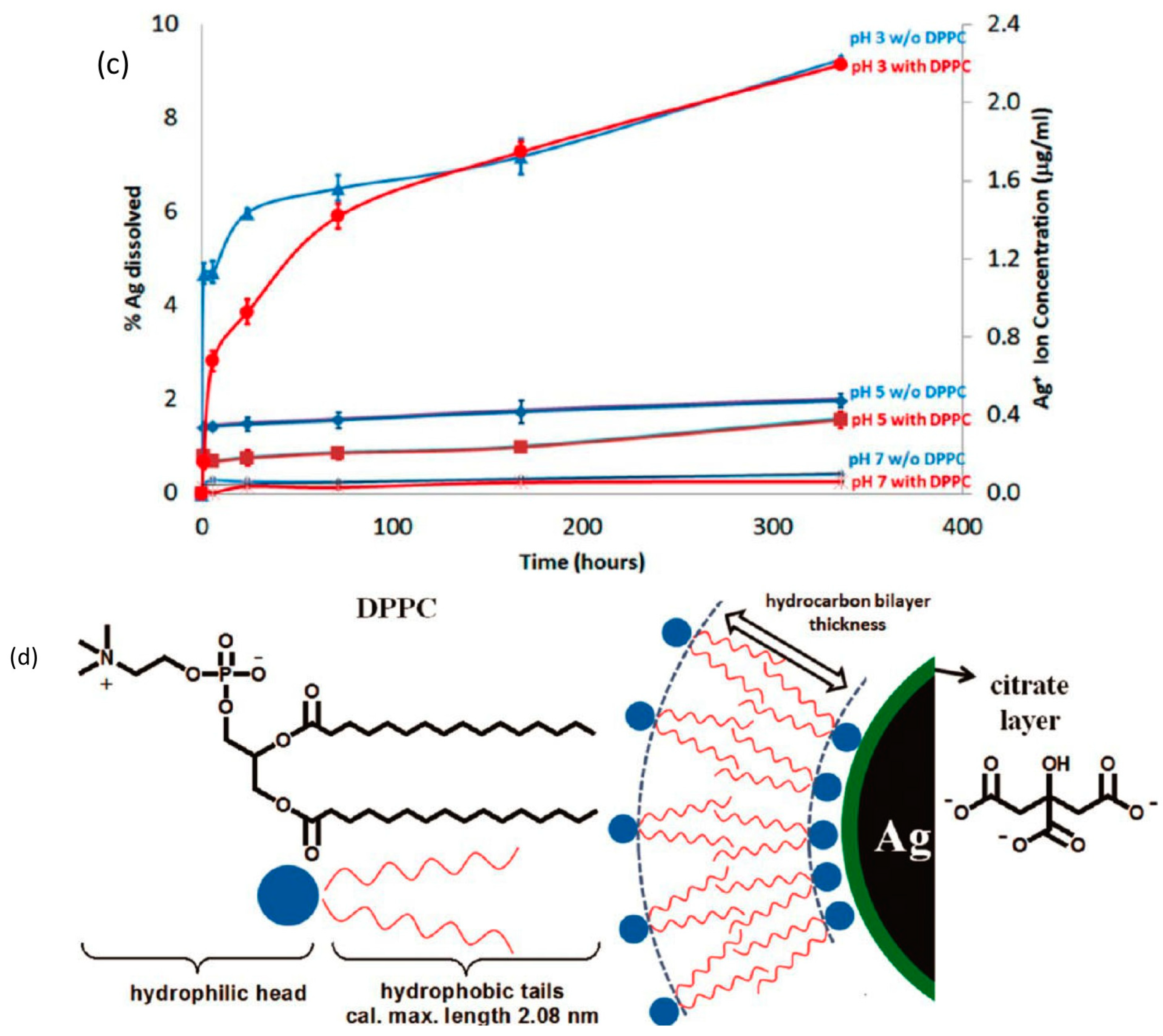 Possible transformations of the AgNPs when they come into contact with the lung surfactant have to be addressed because any interactions could both disrupt the physiological surfactant function, as well as altering their subsequent cellular effects. So far, only a few studies have investigated the stability of AgNPs in environments fully representative of the lung. For example, Stebounova et al., studied the stability of two types of AgNPs, PVP-coated and polymer-coated, in artificial interstitial and lysosomal fluids [28]. Their experimental results and the extended Derjaguin-Landau-Verwey-Overbeek (DLVO) model calculations showed that PVP-capped AgNPs precipitated but polymer-coated AgNPs, with a higher negative surface charge, were more stable in the simulated fluids. However, these simulated fluids were lacking any surfactant components. A few other studies have examined the colloidal stabilization of other types of NPs in rat bronchoalveolar lavage (BAL) [159], phosphate buffered saline (PBS) containing bovine serum albumin (BSA) and DPPC [160,161] or semisynthetic lung fluids consisting of DPPC, palmitoyl-oleoyl-phosphatidylglycerol and SP-B (70:30:1 w/w/w) [162]. These studies found that NPs were well-dispersed in the presence of DPPC and proteins and that synthetic lung fluid was as effective as BAL in dispersing the NPs. Recently, the stability of citrate-capped AgNPs in DPPC was investigated as a function of pH (Figure 4) [23]. A decrease in pH was found to accelerate the kinetics of Ag+ ion release but also promoted particle aggregation and coarsening. DPPC however, delayed the release of Ag+ ions, without significantly altering the total amount of Ag+ released after two weeks. By coating the AgNPs, DPPC improved their dispersion and inhibited aggregation and coarsening. This may allow AgNPs to enter cells more easily, leading to a greater ROS formation within cells, reduced cell viability and increased DNA damage.