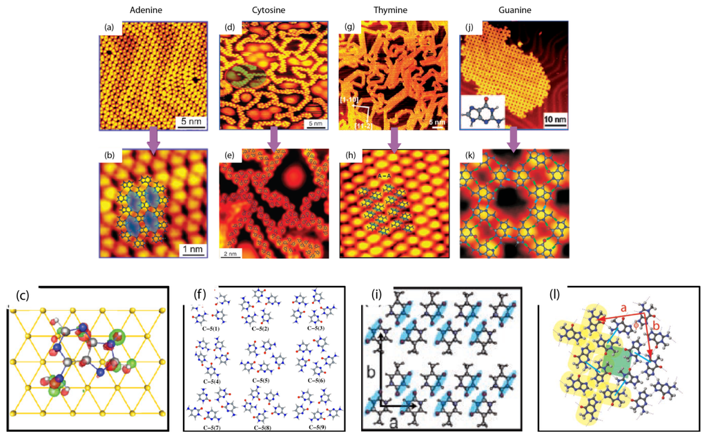 Figure 1. Experimental STM images and theoretical models for Adenine (ac); Cytosine (df); Thymine (gi); and Guanine (jl) monolayers on the Au (111) surface. a, d, g and j show large areas of the experimentally observed DNA base monolayer structures, whereas b, e, h and k give close-up images with overlays of the theoretical models of Adenine, Cytosine, Thymine and Guanine, respectively. c, f, i and l show the molecular structures of these four kinds of single bases.