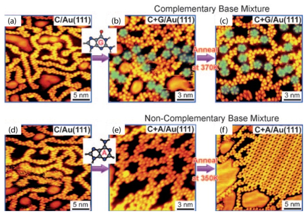 In the last section, we introduced the structures assembled by each of the four NA bases on a surface at vacuum. Here, the co-assembly of purine and pyrimidine will be introduced, such as the G–C complementary pair and the A–C non-complementary pair (Figure 2) [23]. Initially, G and A molecules are able to self-assemble into well-ordered 2D structures, while C molecules at lower coverage do not assemble into any structures, but form interconnected 1D zigzag filaments at high coverage. In the cases of co-assemblies of G–C and A–C, the different assembled behaviors were revealed, respectively. Pure C assembles were obtained initially, after the deposition of G and A molecules, the co-assemblies of G–C is obviously different from the ones of A–C. In the case of the co-assembly of G–C, some five-fold rings appear, but there is almost no change in the case of A–C assembly compared to the pure C assemblies. After annealing treatment, the assemblies of the G–C pair still exist, however, the assemblies of A–C segregated into two phases. A molecules form stable hexagonal 2D islands with C molecules present, but connecting with themselves in filaments and attaching to A island boundaries. It is suggested that the interaction between G and C must be much stronger than that in C–C and G–G pairs. Once the Watson-Crick complementary base pair is formed it will not break easily. However, the A–C pair is not as stable as the G–C pair, and it can easily be broken by thermal annealing. The binding energies for the most stable C–A pairs are between −0.75 and −0.88 eV, which are slightly smaller than, or comparable with, the most stable C–C (−0.99 eV) and A–A (−0.86 eV) pairs. Therefore, the segregation of A–C molecule assemblies is well explained.