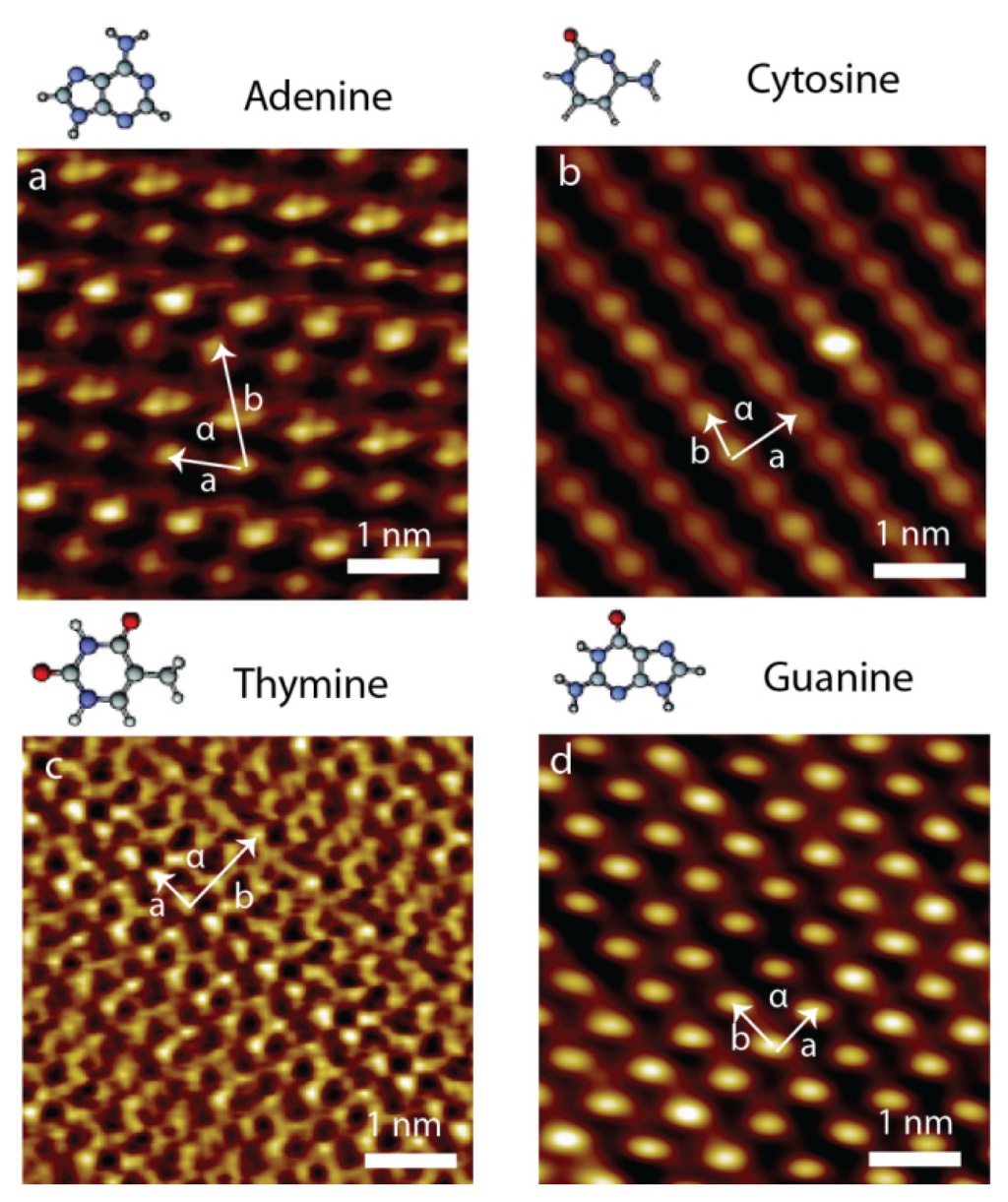 We have presented novel 2D supramolecular nanostructures assembled by NA complementary bases on a surface. NA bases have the versatility to self-assemble into a wide variety of nanoscale patterned structures. Pure guanine and adenine are able to assemble into molecular network patterns on the surface by hydrogen bond interaction; cytosine and thymine are capable of constructing the molecular chain structure. However, the self-assembled nanostructures formed by the mixture of G–C and A–T are significantly different from the ones formed by pure DNA bases. In regard to the supramolecular chemistry, these specific interactions from the NA bases could make the field very intriguing due to the wealth of supramolecular bonds that NA bases use to interact with each other [30]. There are 28 possible base pairing motifs, employing at least two hydrogen bonds, formed between these four NA bases [4]. The placement of these NA bases on the end of small molecules or polymers, when introducing the specific interaction, will help to construct a variety of supramolecular nanostructures that can be applied in either biological or material systems [30]. To obtain insight into the self-assembled behaviors of these supramolecular systems, STM studies at ambient condition will provide a potential approach towards visualizing the assembled structures on the surface. The observation and understanding of these novel nanoscale patterns formed from NA base pairing based systems will not only be interesting from the perspective of molecular organization at interfaces, but it will be useful for understanding the mechanism of material construction [30]. Furthermore, the study of self-assemblies of nucleic acid base molecules is of great use for the future understanding of the mechanisms behind the assemblies of NA bases and their complexes with amino acids and protein or more complex biological systems.