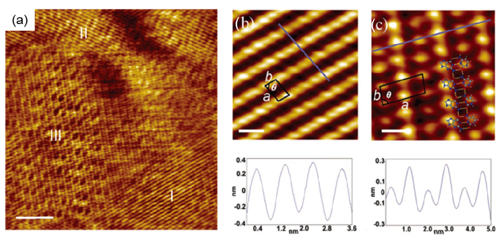 Figure 4. Co-adsorption of guanine and cytosine at the 1-octanol/HOPG interface. (a) Typical STM image presenting three domains, marked with I, II and III. Scan size: 50 nm × 50 nm; (b) Correlation averaged magnified image of the structure in domain I, 5 nm × 5 nm, a unit cell is indicated. There is a line profile on the bottom of (b) along the blue line in the top of the STM image; and (c) Correlation averaged magnified image of the structure in domain III, 5 nm × 5 nm, a unit cell is indicated. Bottom: height profile along the blue line in the top of panel. The structural model is superimposed on the STM image. Iset = 549 pA, Vbias = 750 mV. (Reproduced with the permission from [25]. Copyright 2006 American Chemistry Society.).