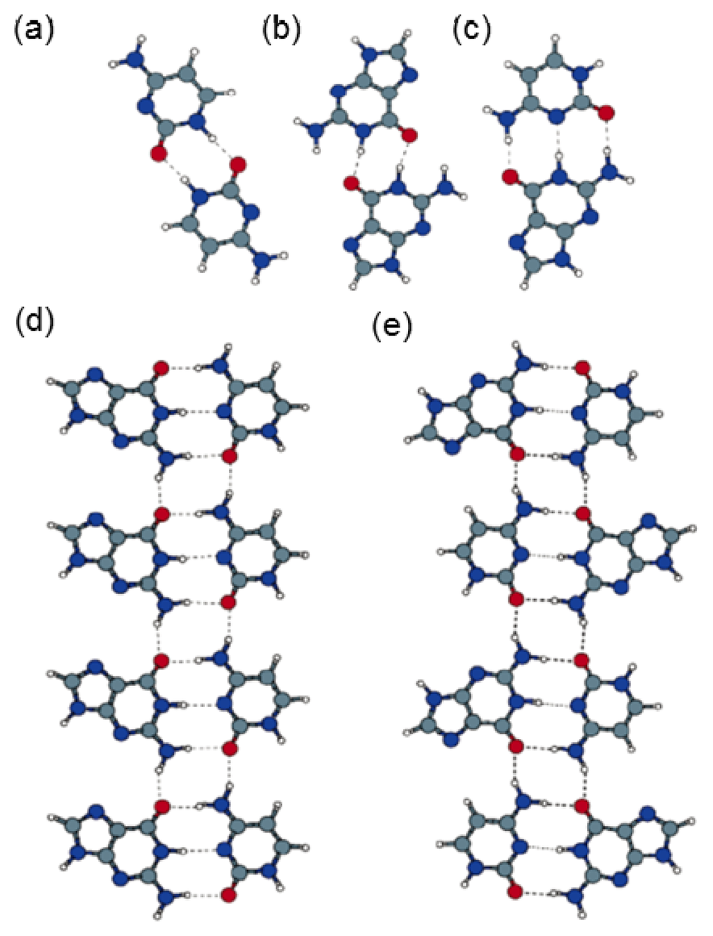 Figure 5. Structural model: (a) C dimer; (b) G dimer; (c) GC dimer; (d) Chain of GC dimers; and (e) Chain of GCGC-quartet formed by alternating GC dimers. (Reproduced with permission from [25]. Copyright 2006, American Chemistry Society.).