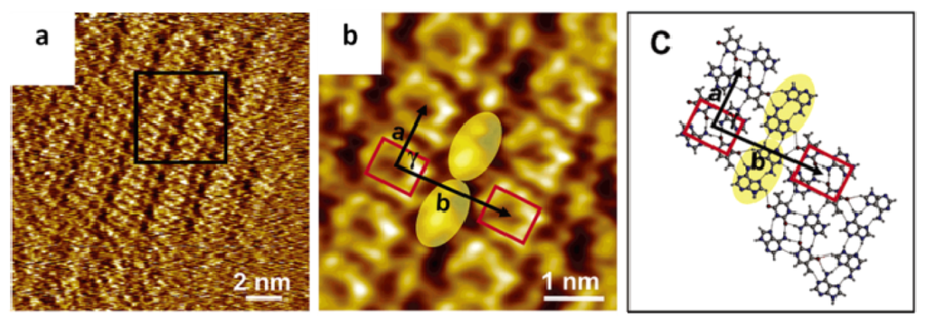 Figure 6. (a) STM image of A and T mixture at the 1-octanol/HOPG interface; (b) A correlation averaged zoom-in image of the part indicated in image (a) by a black square; and (c) The calculated model: each cycle is formed by four molecules 2A + 2T, resulting in reverse Hoogsteen A–T–A–T quartets adjacent to homochiral chains of A–A dimer. Cycle is indicated by red rectangles, and the unit cell is indicated in black. (Reproduced with permission from [27]. Copyright 2006 American Chemistry Society.).