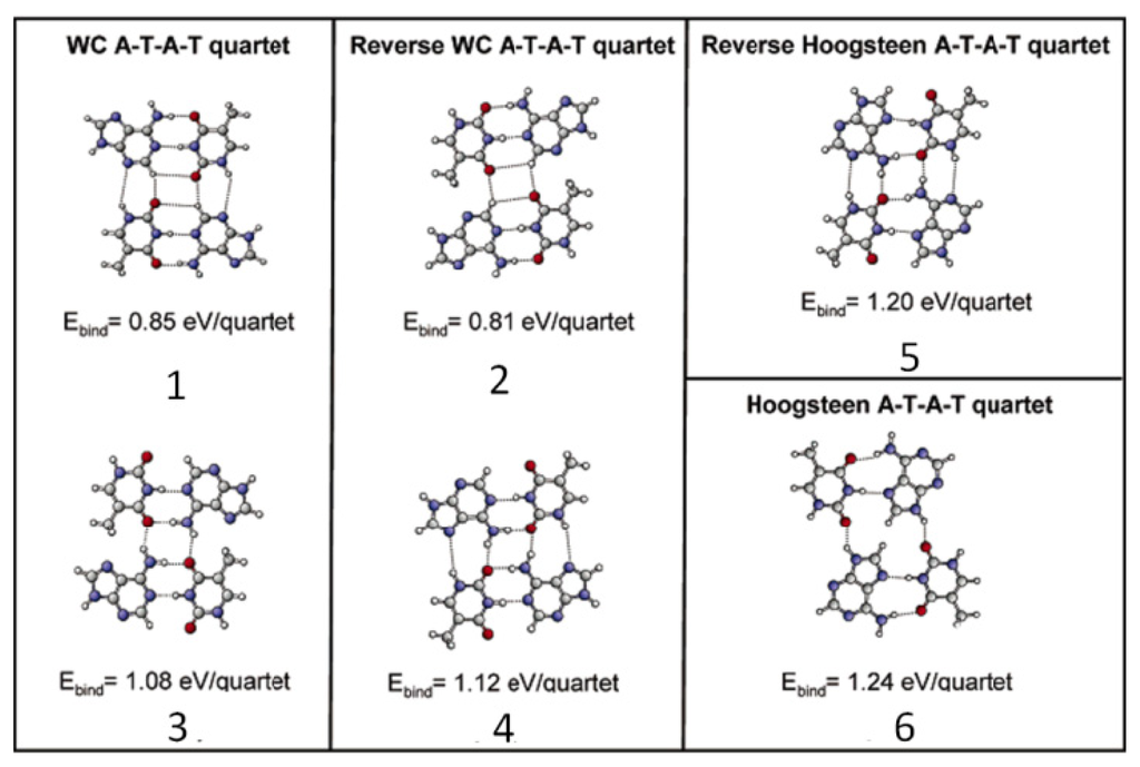 Figure 7. A–T–A–T quartets and their calculated binding energies. Numbers are used to identify the A–T–A–T quartets. (Reproduced with the permission from [27]. Copyright 2006 American Chemistry Society.).