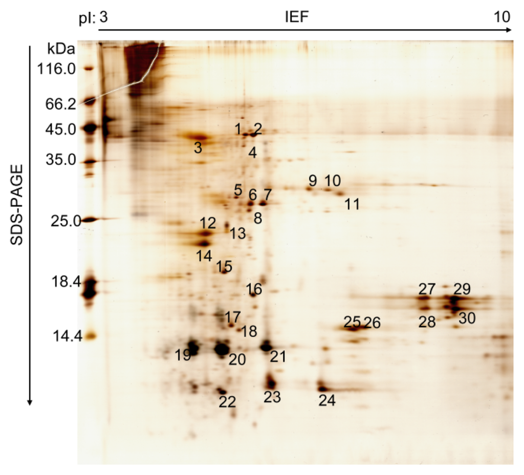 Before electrophoresis, 200 μg of total PM proteins was mixed in 350 mL of rehydration buffer I (8.0 M urea, 2% (v/v) CHAPS, 0.8% (w/v) DTT, 0.5% IPG buffer, pH 3–10, 0.002% (w/v) bromophenol blue) and loaded onto an 18 cm broad range IPG strip (pH 3 to 10 NL; GE Healthcare, Milwaukee, MI, USA). Isoelectric focusing (IEF) was done at 20 °C according to the following protocol: 50 V for 12 h, 100 V for 1 h, 200 V for 1 h, 500 V for 30 min, 1000 V for 30 min, 3000 V for 30 min, 5000 V for 30 min then 8000 V until 100,000 Vh. The current limit is 50 μA per IPG strip. Before SDS-PAGE, the IPG strips were equilibrated for 15 min in equilibration buffer I (6 M urea, 50 mM Tris-HCl, pH 8.8, 2% (w/v) SDS, 30% (v/v) glycerol, 1% (w/v) DTT) and later for a further 15 min in equilibration buffer II (equilibration buffer I containing 2.5% (w/v) iodoacetamide instead of DTT). Equilibrated strips were overlaid onto 15% (w/v) polyacrylamide gel and subjected to 2-DE in an Ettan DALTsix Electrophoresis System (GE Healthcare, Milwaukee, MI, USA) followed by staining with silver nitrate [39]. At least three biological replicates were performed for PM protein samples. Spots were scanned with a high-resolution image scanner III at 300 pixels and analyzed by ImageMaster 2D software (GE healthcare, Milwaukee, MI, USA).