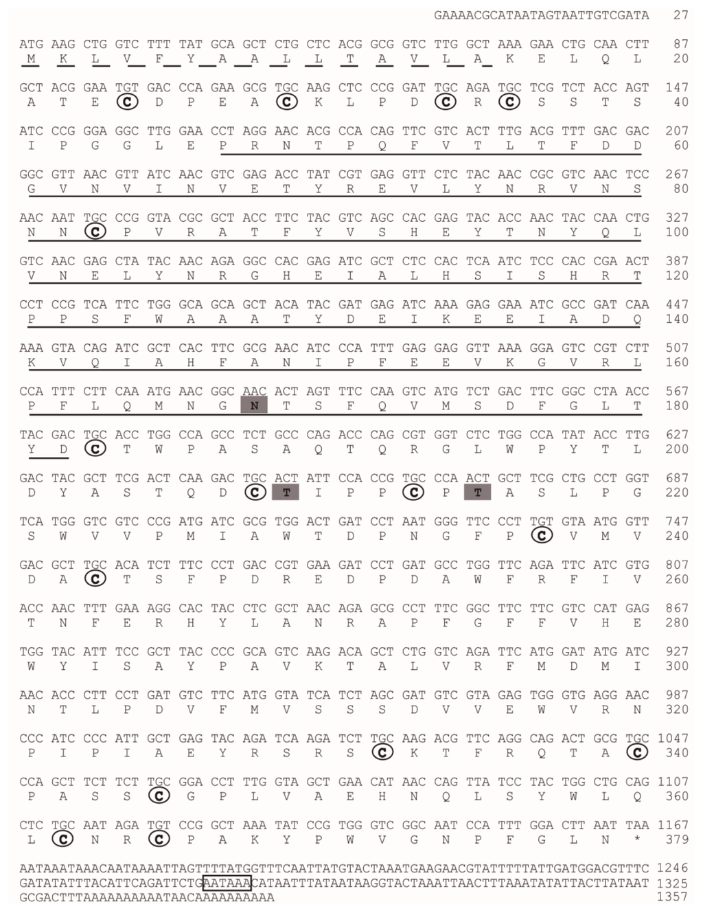 The full-length cDNA sequences and deduced amino acid sequences of BmCDA7. The predicted signal peptide is underlined with a broken line. A potential polyadenylation signal sequence is boxed. The chitin deacetylase domain is underlined. Cysteines in the mature protein sequence are in bold type and circled. The N-glycosylation sites and O-glycosylation sites are showed with bold type and grey background.