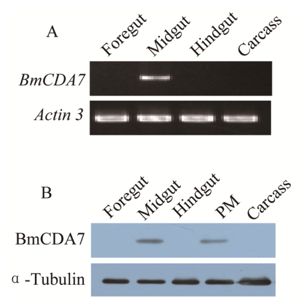 Tissue distribution of BmCDA7. (A) The spatial expression profile at the transcriptional level. Total RNA of different tissues from the third day of the fifth instar larvae were used in the RT-PCR analysis. Silkworm actin 3 gene was used as the control; (B) Tissue-specific localization of BmCDA7 protein. Western blotting analysis was performed to detect the expression of the protein. Total protein from different tissues from the third day of the fifth instar larvae were used in this analysis. Tubulin was used as the positive control. PM: Peritrophic membrane; Carcass: All tissues minus alimentary canal.