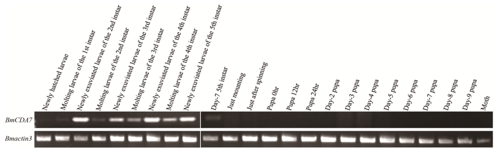 The temporal expression profiles of BmCDA7. To determine the temporal specificity of expression, three whole silkworm bodies (except for the midgut contents) were collected at the times of the first-fourth instar larvae, middle-stage silkworm and molting silkworm. Total RNA was extracted and was used as template for first-strand cDNA synthesis. Bmactin 3 transcript with the same cDNA template served as an internal control.