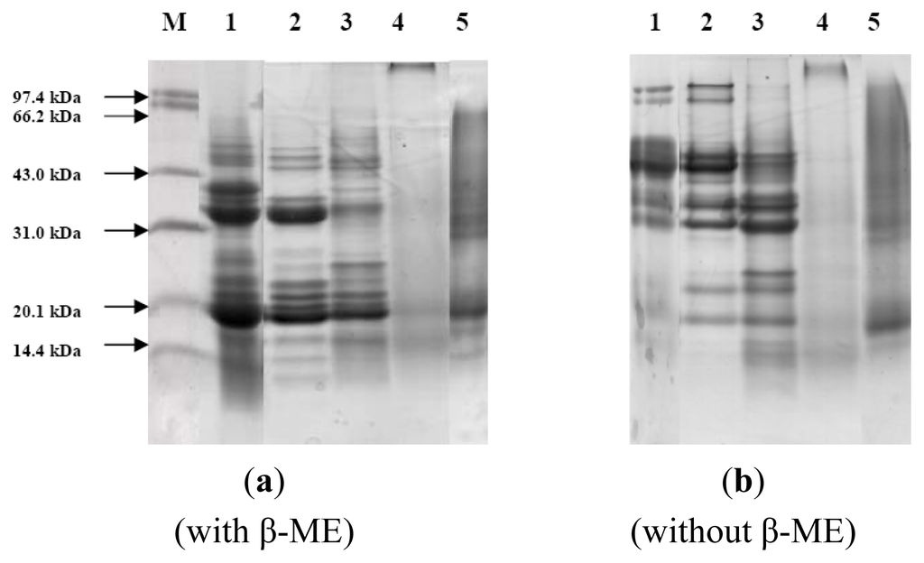 - Laemmli, U.K. Cleavage of structural proteins during the assembly of the head of bacteriophage T4. Nature 1970, 227, 680–685. [Google Scholar]